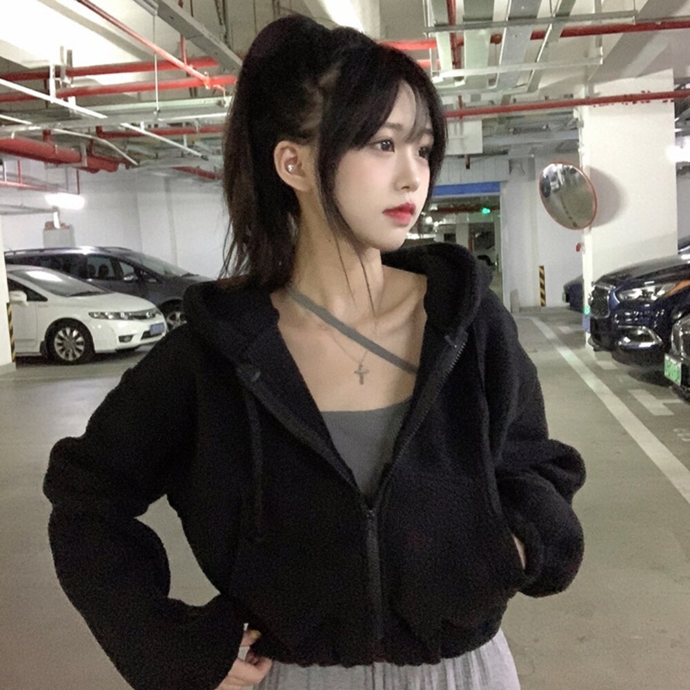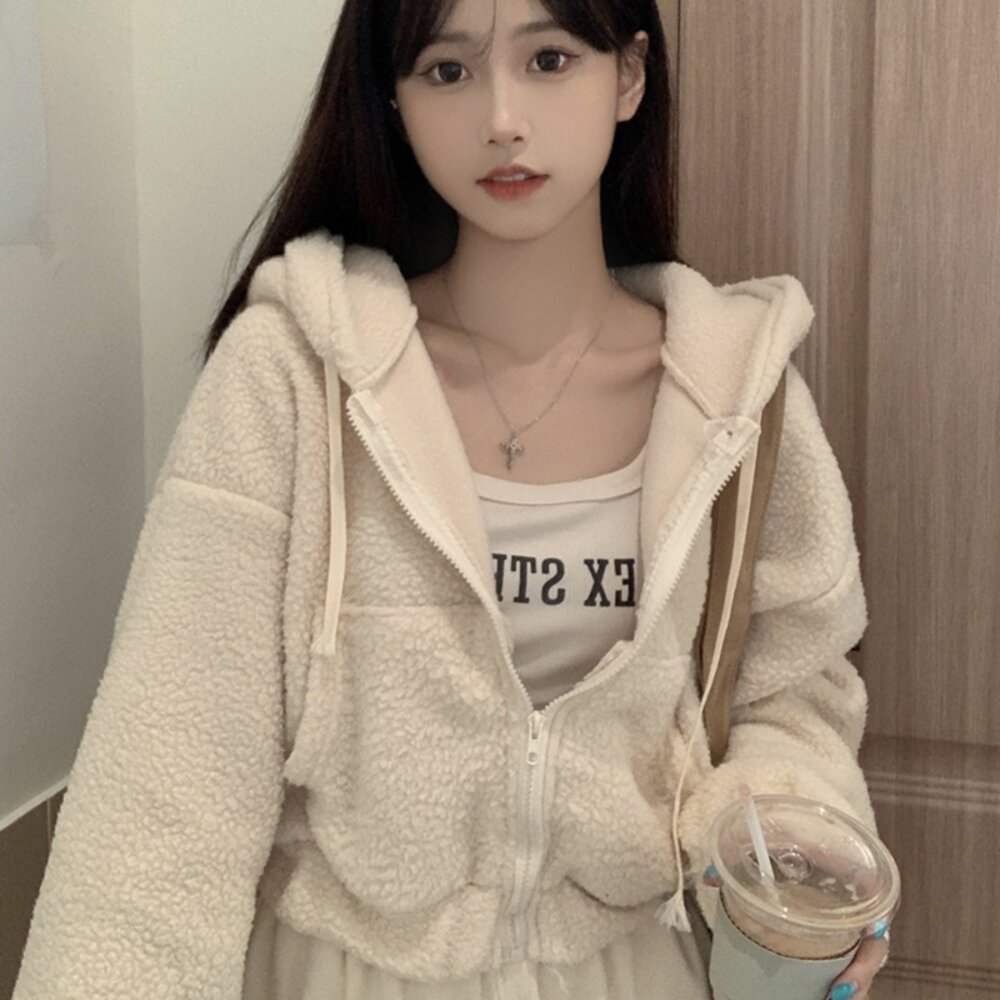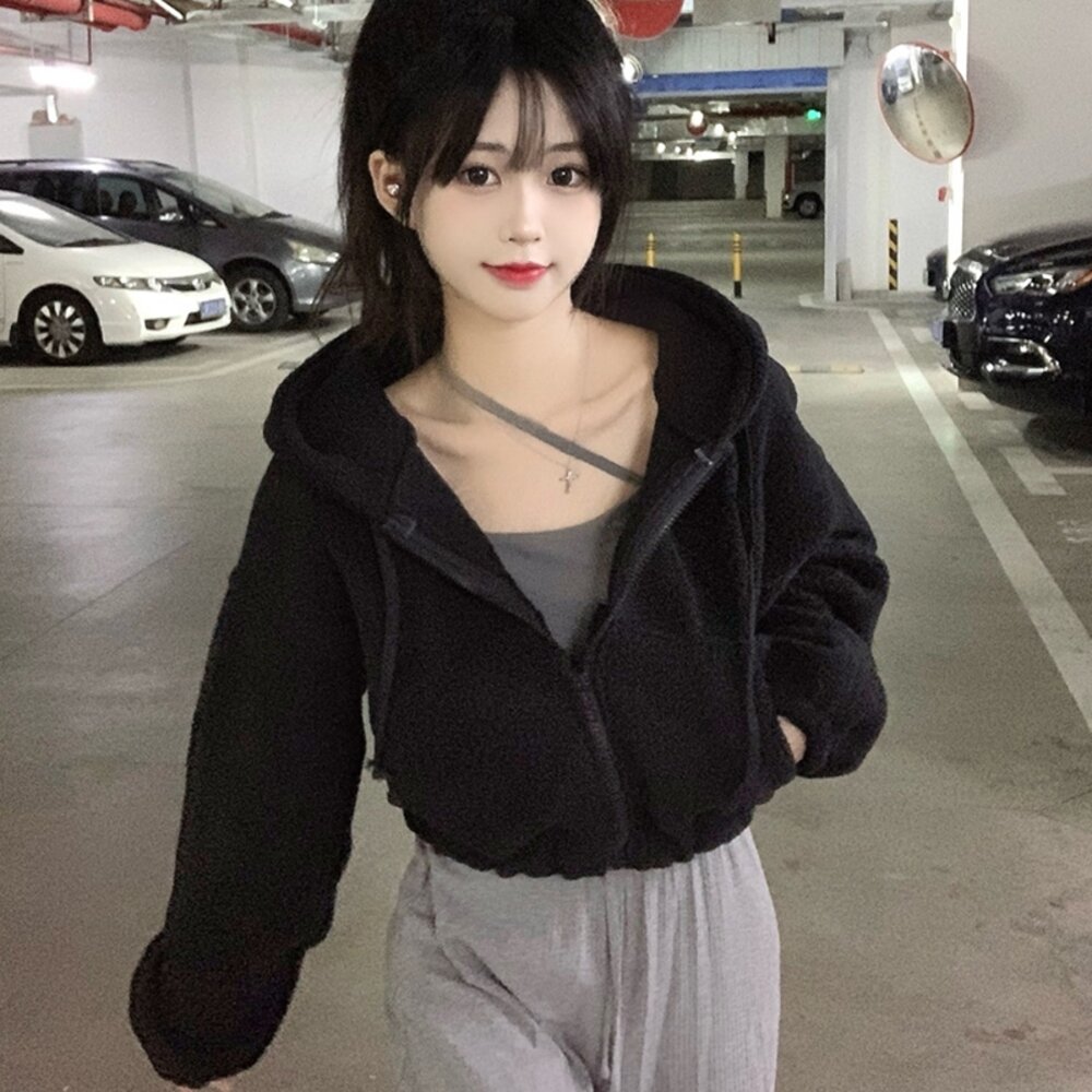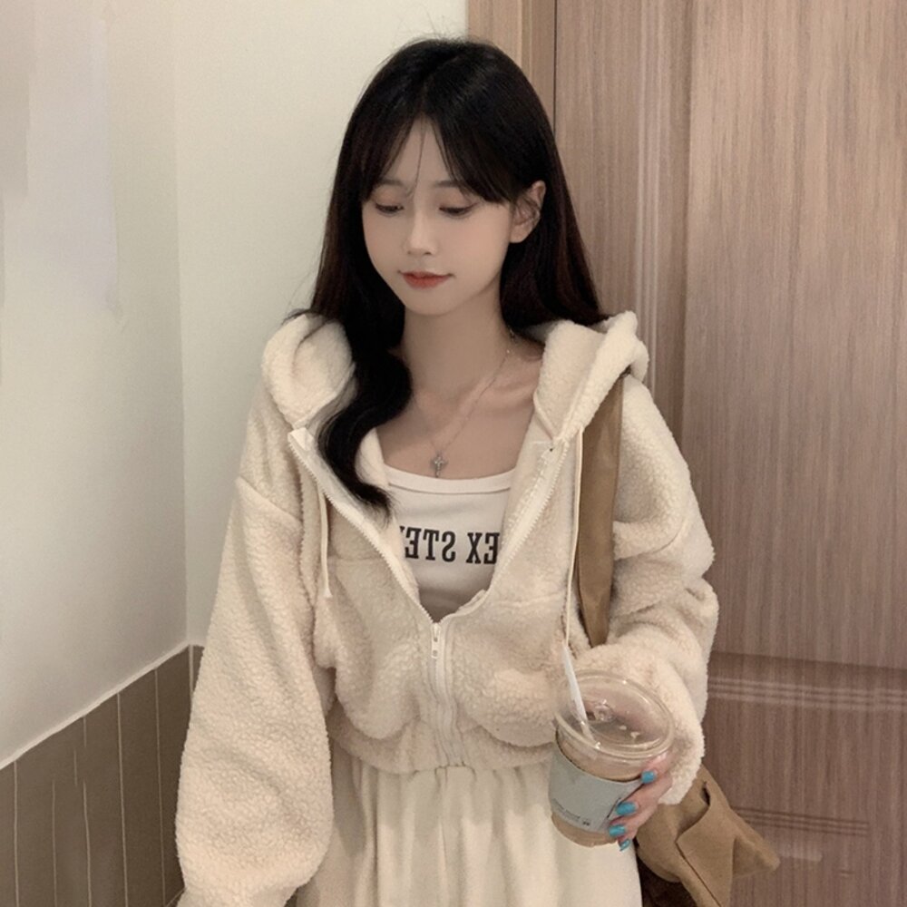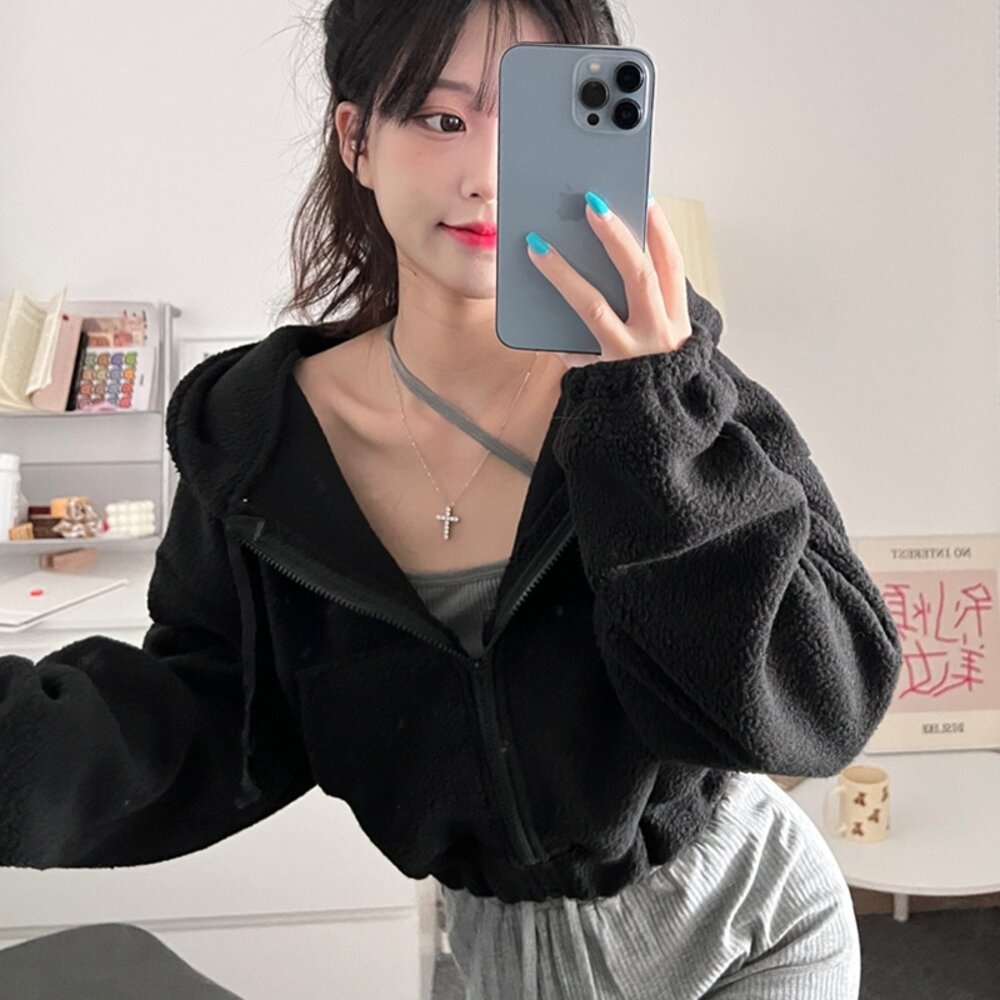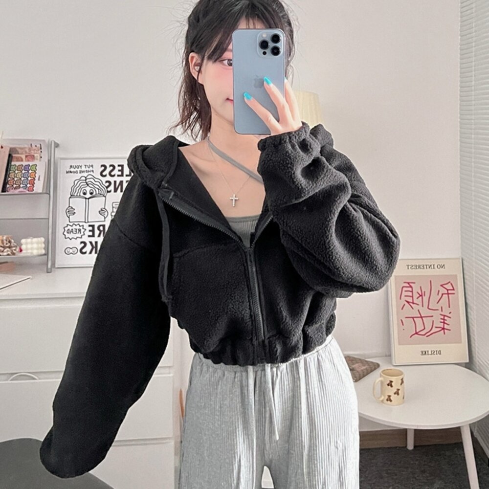 【台灣發貨】韓版毛絨連帽短版外套 外套 防曬外套 女裝 上衣 衣服 【J180】-圖片-1