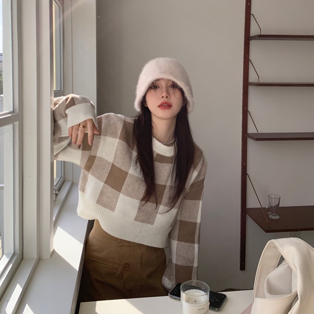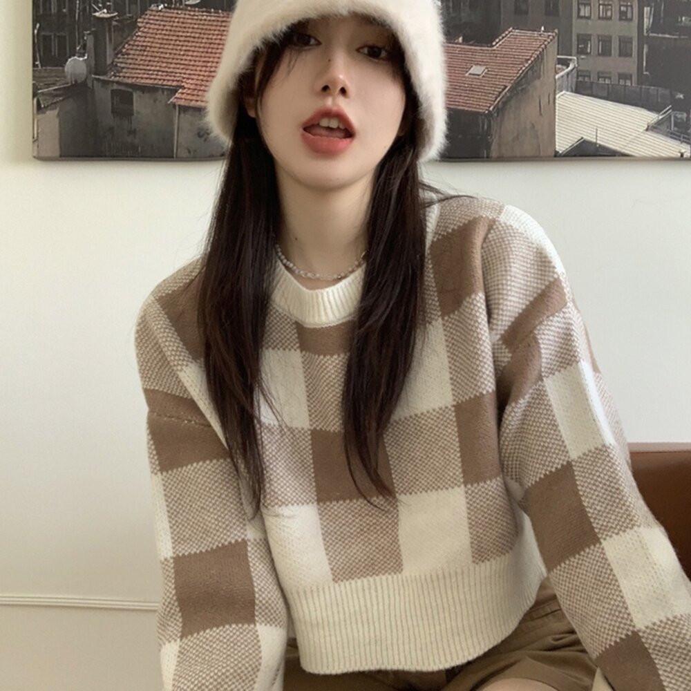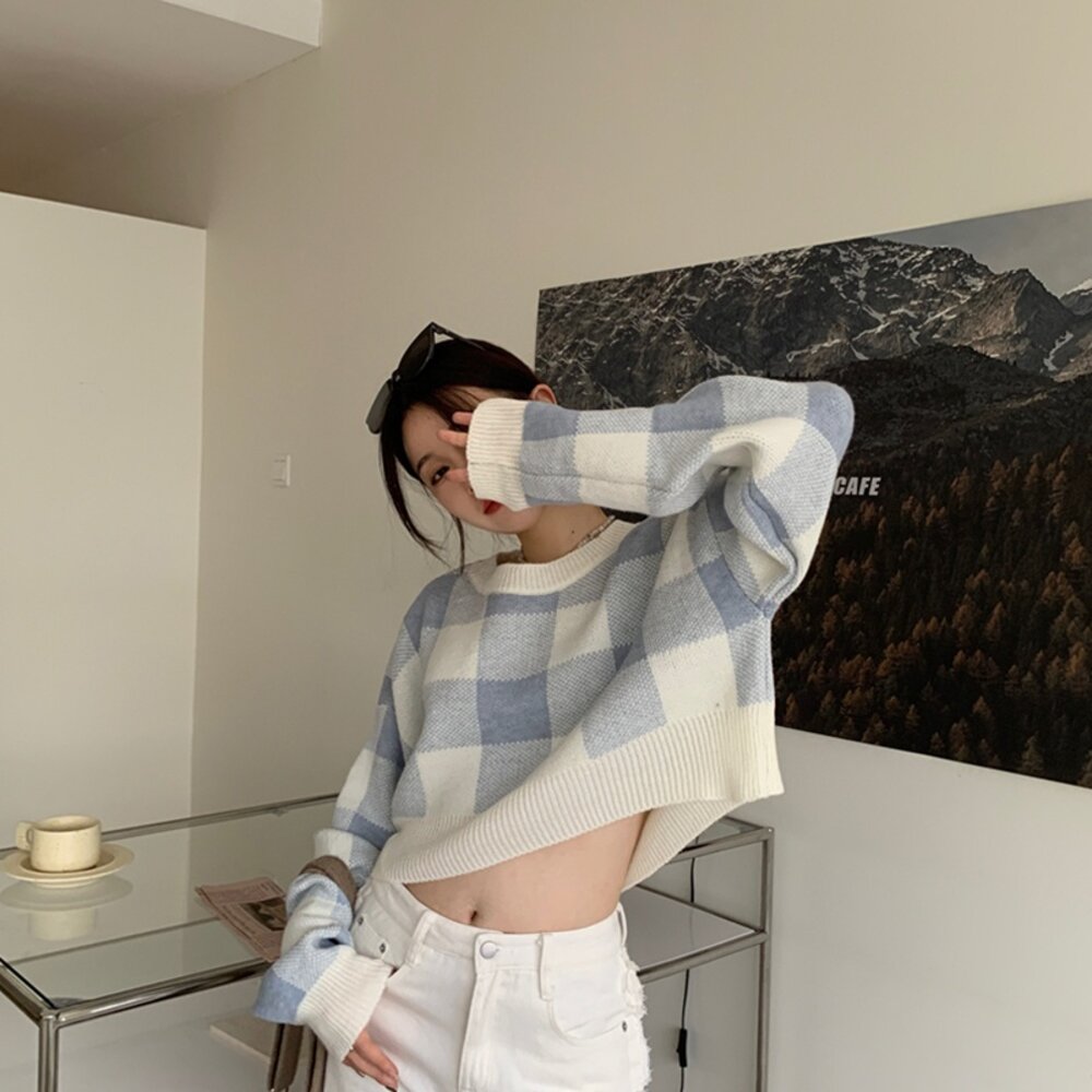 【台灣發貨】韓版復古格子慵懶風毛衣 長袖上衣 長袖t恤 衣服 女裝 上衣【W251】-圖片-2