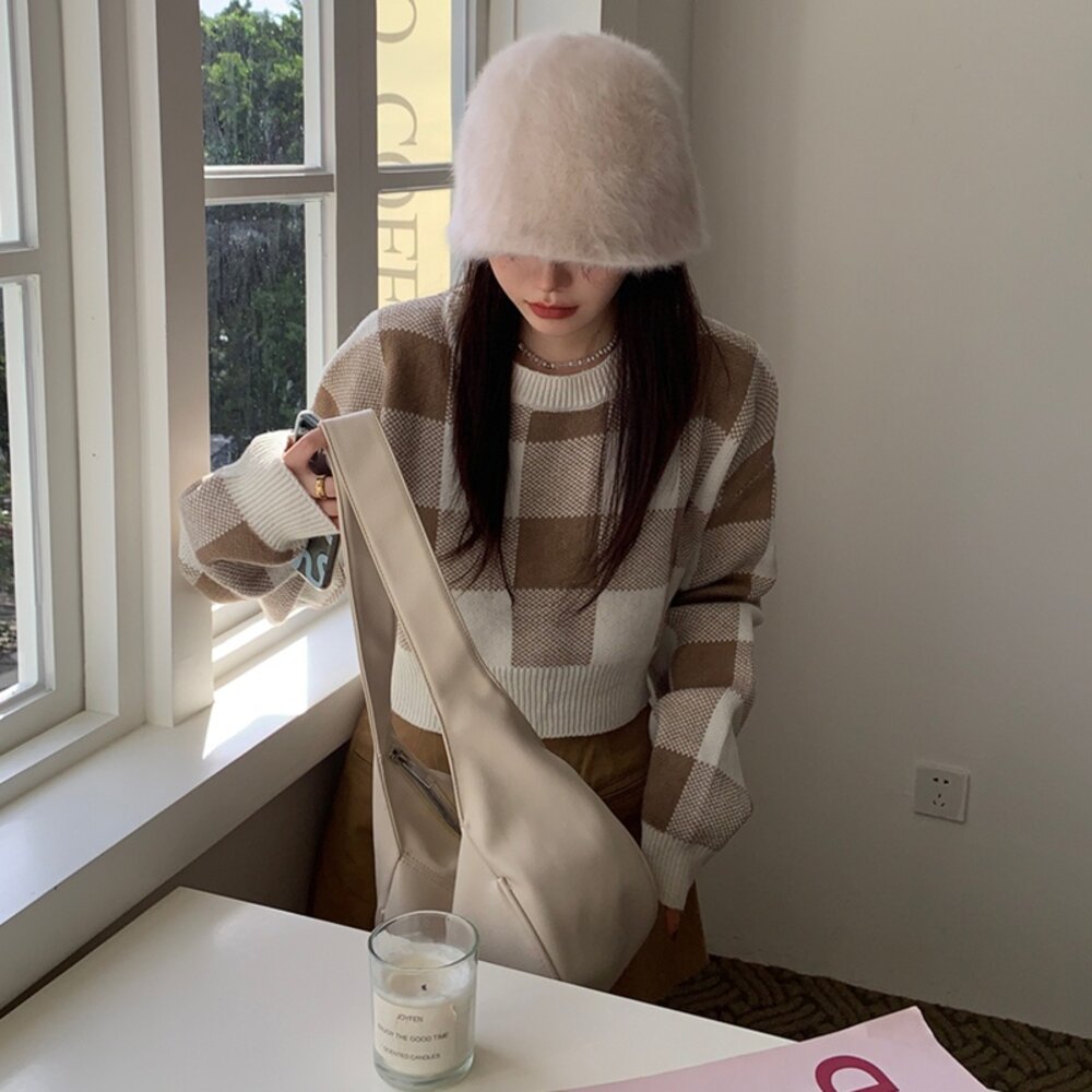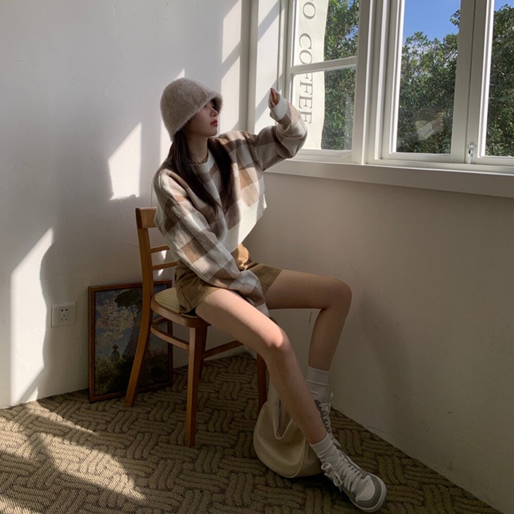 【台灣發貨】韓版復古格子慵懶風毛衣 長袖上衣 長袖t恤 衣服 女裝 上衣【W251】-圖片-6