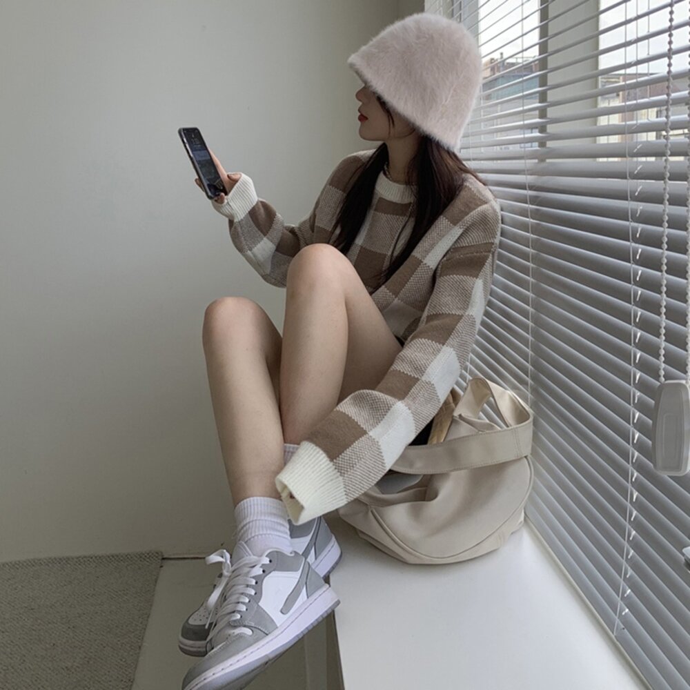 【台灣發貨】韓版復古格子慵懶風毛衣 長袖上衣 長袖t恤 衣服 女裝 上衣【W251】-圖片-1