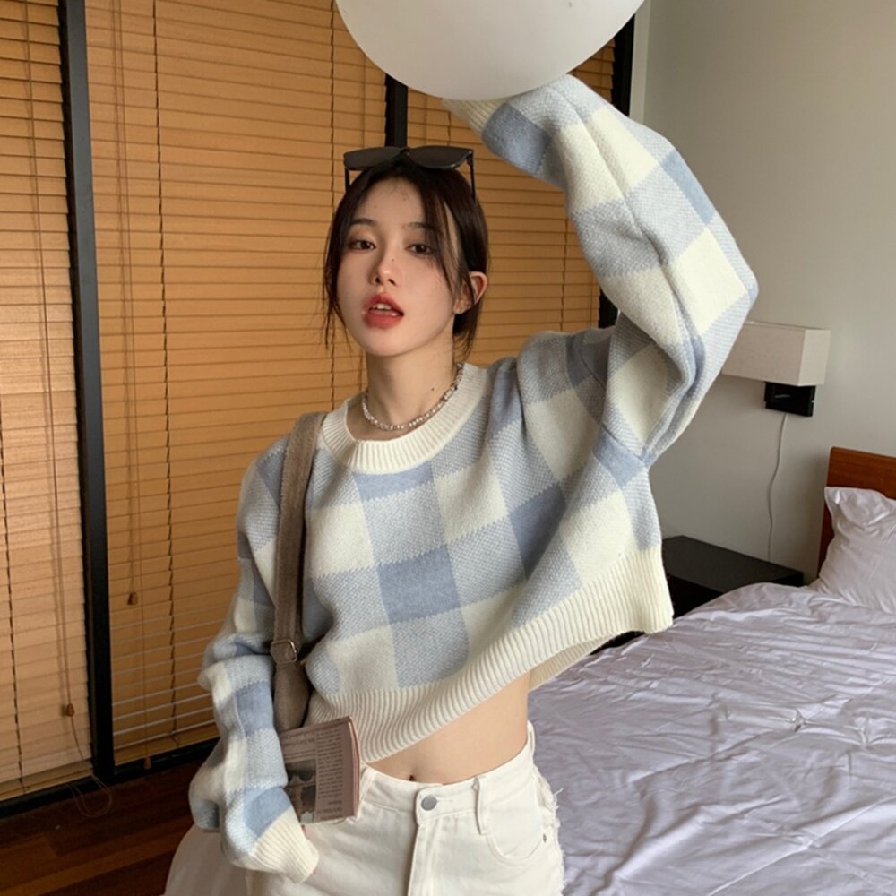 【台灣發貨】韓版復古格子慵懶風毛衣 長袖上衣 長袖t恤 衣服 女裝 上衣【W251】-圖片-8