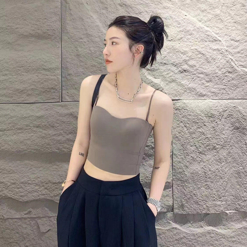 【台灣發貨】韓版冰絲一字肩V領美背短版背心 帶胸墊免穿內衣 小可愛 背心 衣服 女裝 上衣【V259】-圖片-7
