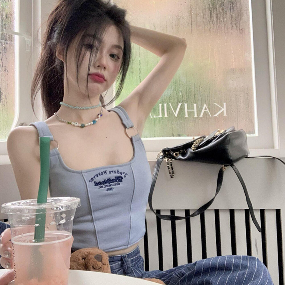 【台灣發貨】韓版不規則字母圓環吊帶背心 帶胸墊免穿內衣 小可愛 背心 衣服 女裝 上衣【V307】-圖片-1