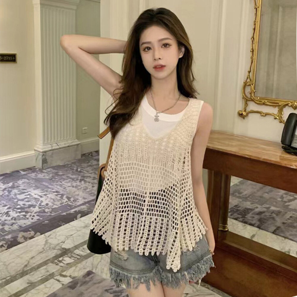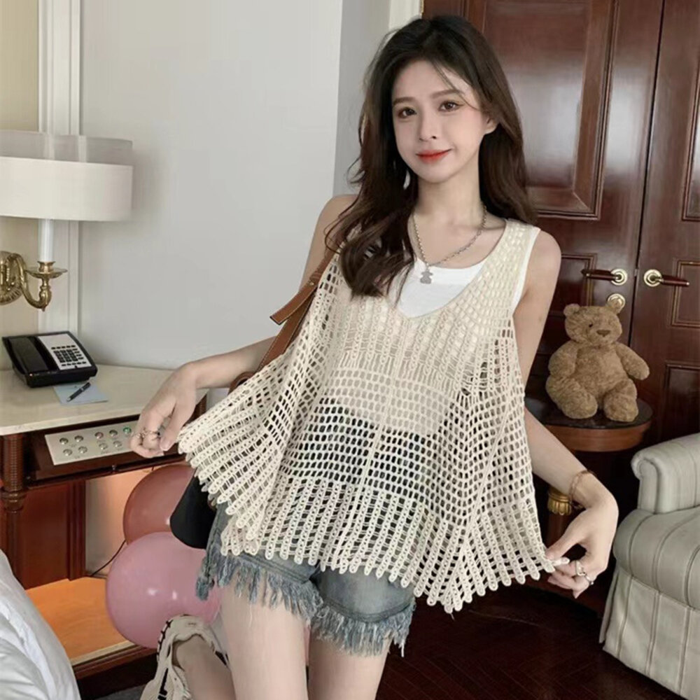 【台灣發貨】韓版鏤空寬鬆慵懶風針織背心 小可愛 背心 衣服 女裝 上衣【V302】-圖片-1