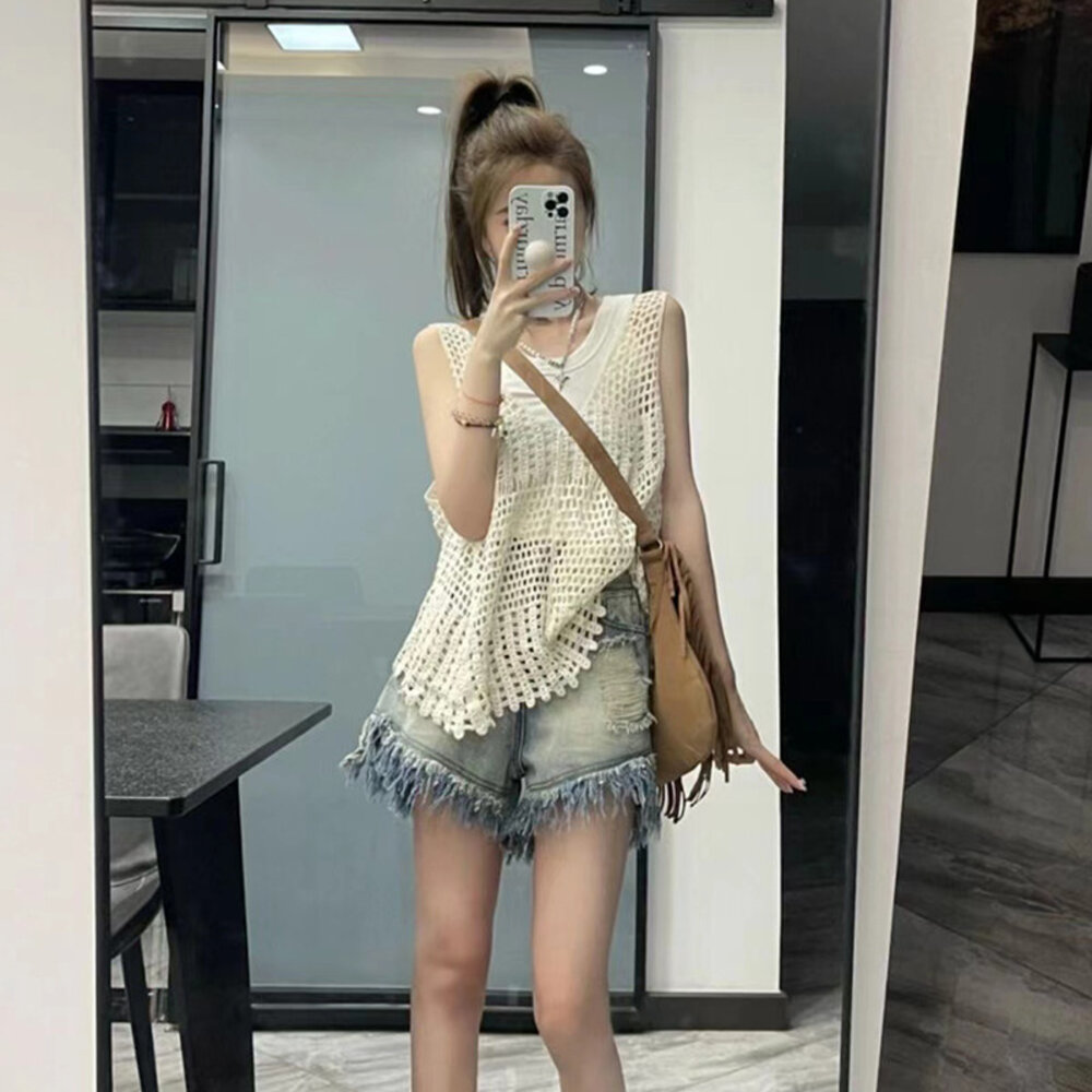 【台灣發貨】韓版鏤空寬鬆慵懶風針織背心 小可愛 背心 衣服 女裝 上衣【V302】-圖片-5