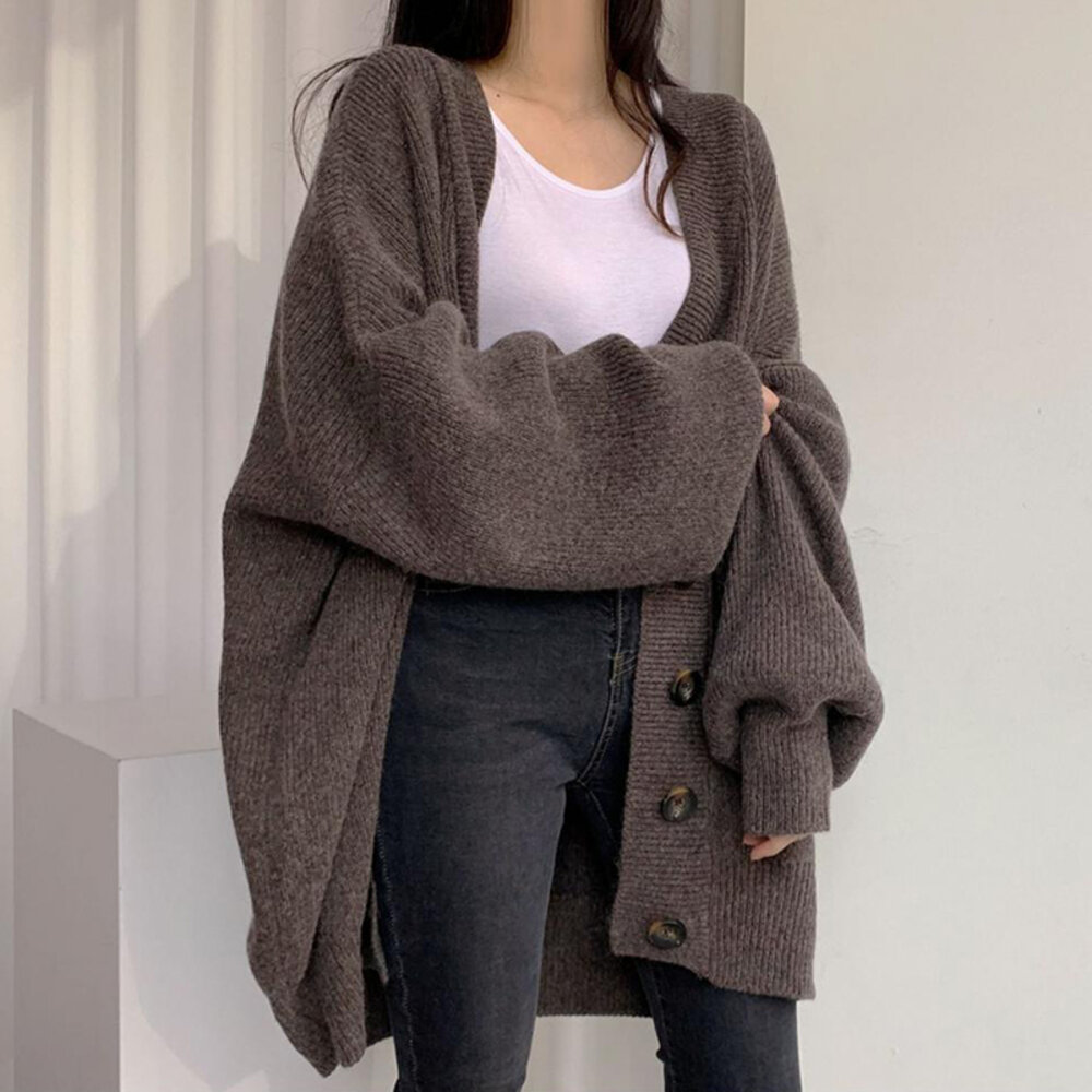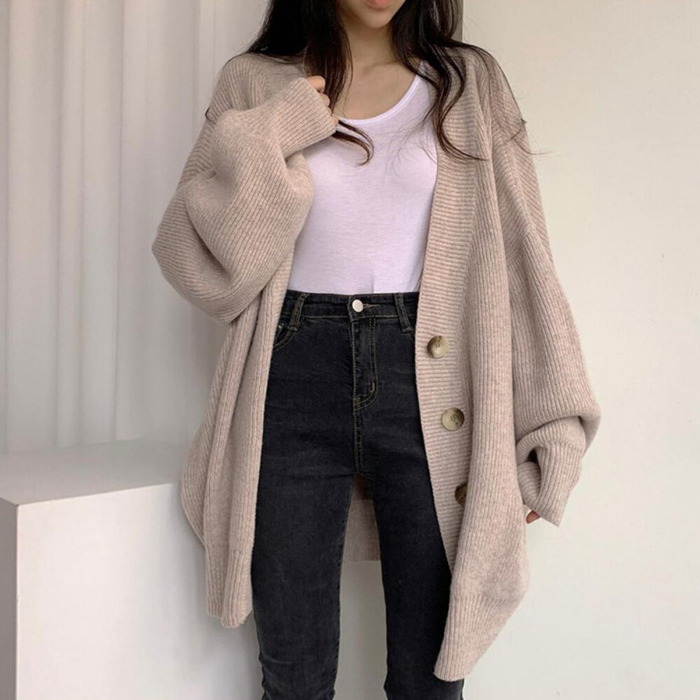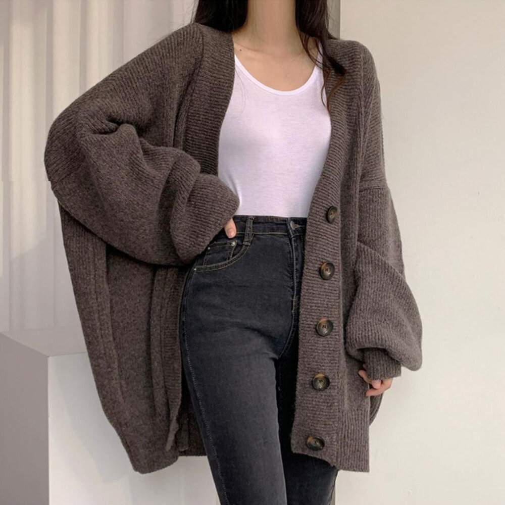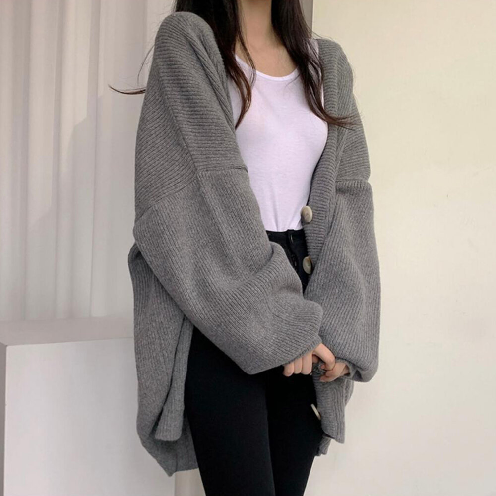 【台灣發貨】韓版慵懶風排扣寬鬆燈籠袖針織外套 外套 防曬外套 女裝 上衣 衣服【J262】-圖片-1