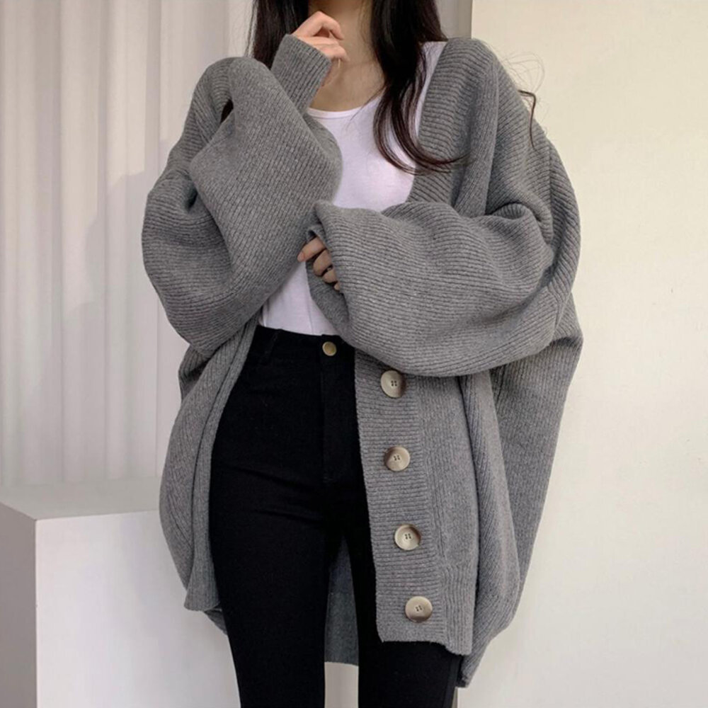 【台灣發貨】韓版慵懶風排扣寬鬆燈籠袖針織外套 外套 防曬外套 女裝 上衣 衣服【J262】