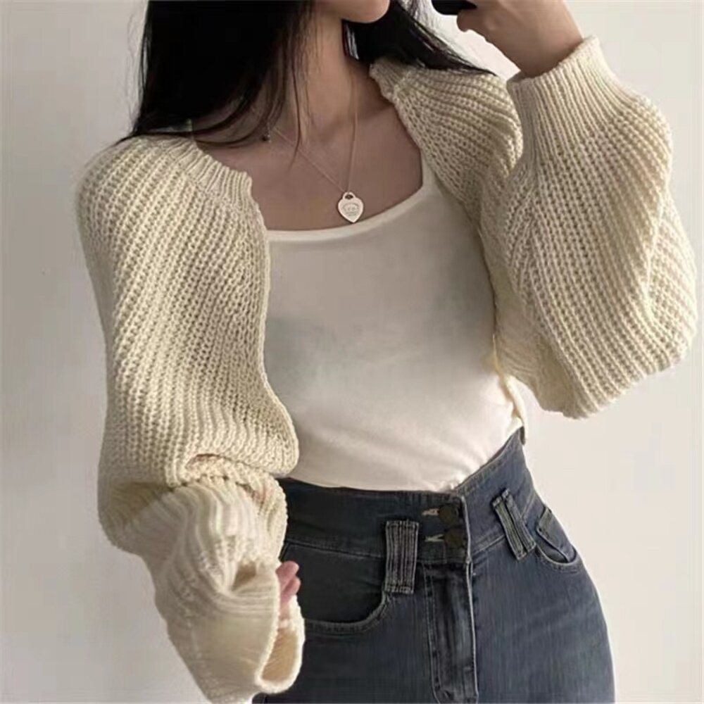 【台灣發貨】韓版法式小眾氣質燈籠袖短版針織外套外套 防曬外套 女裝 上衣 衣服【J195】