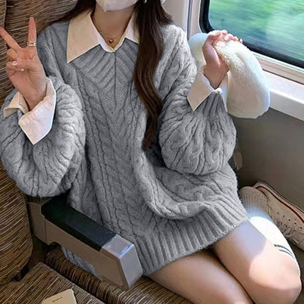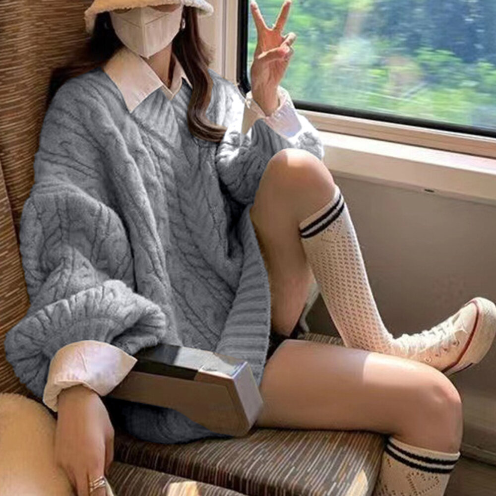 【台灣發貨】韓版顯瘦慵懶風V領長版毛衣 長袖上衣 長袖t恤 衣服 女裝 上衣【W396】-圖片-2