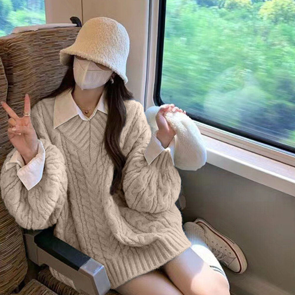 【台灣發貨】韓版顯瘦慵懶風V領長版毛衣 長袖上衣 長袖t恤 衣服 女裝 上衣【W396】-圖片-4