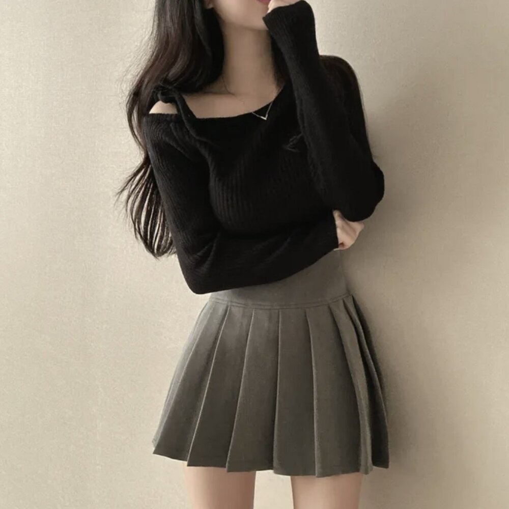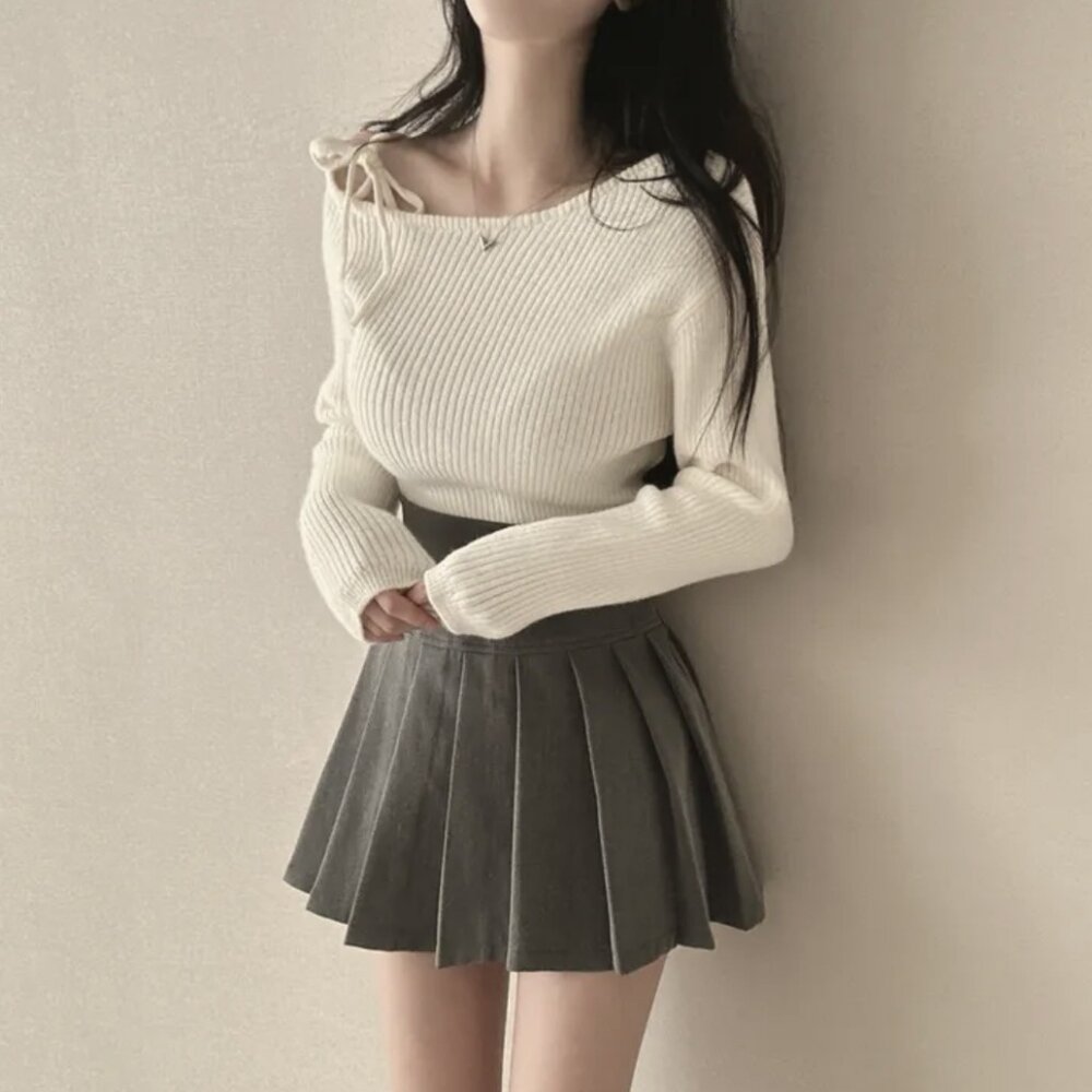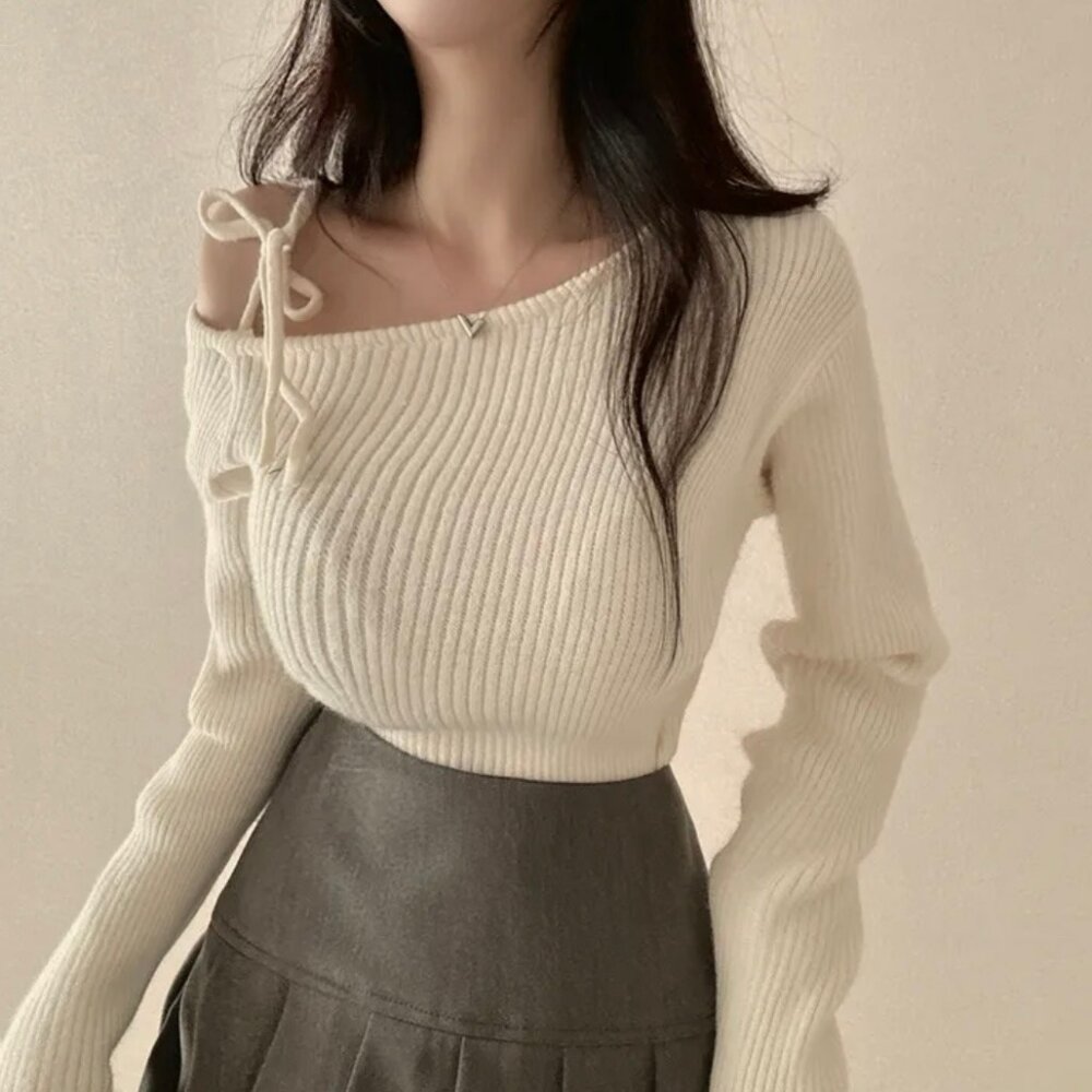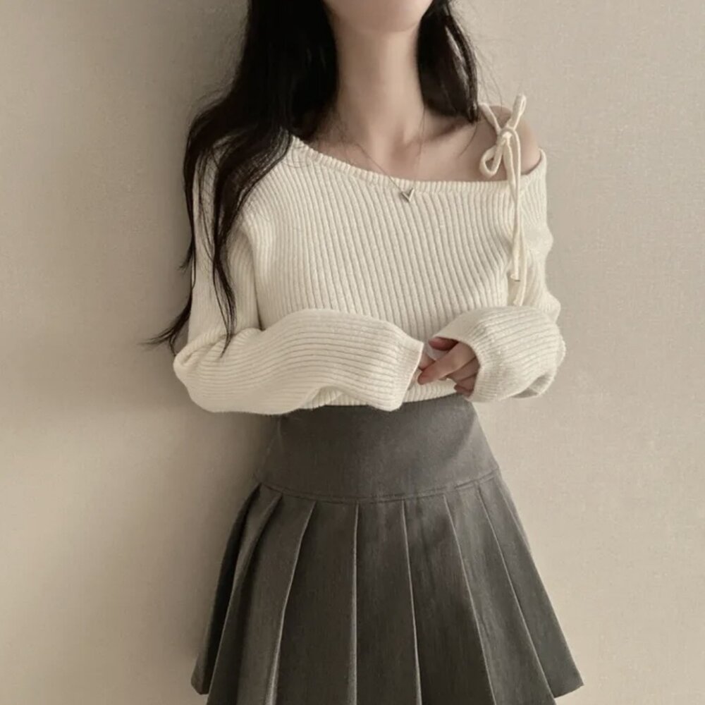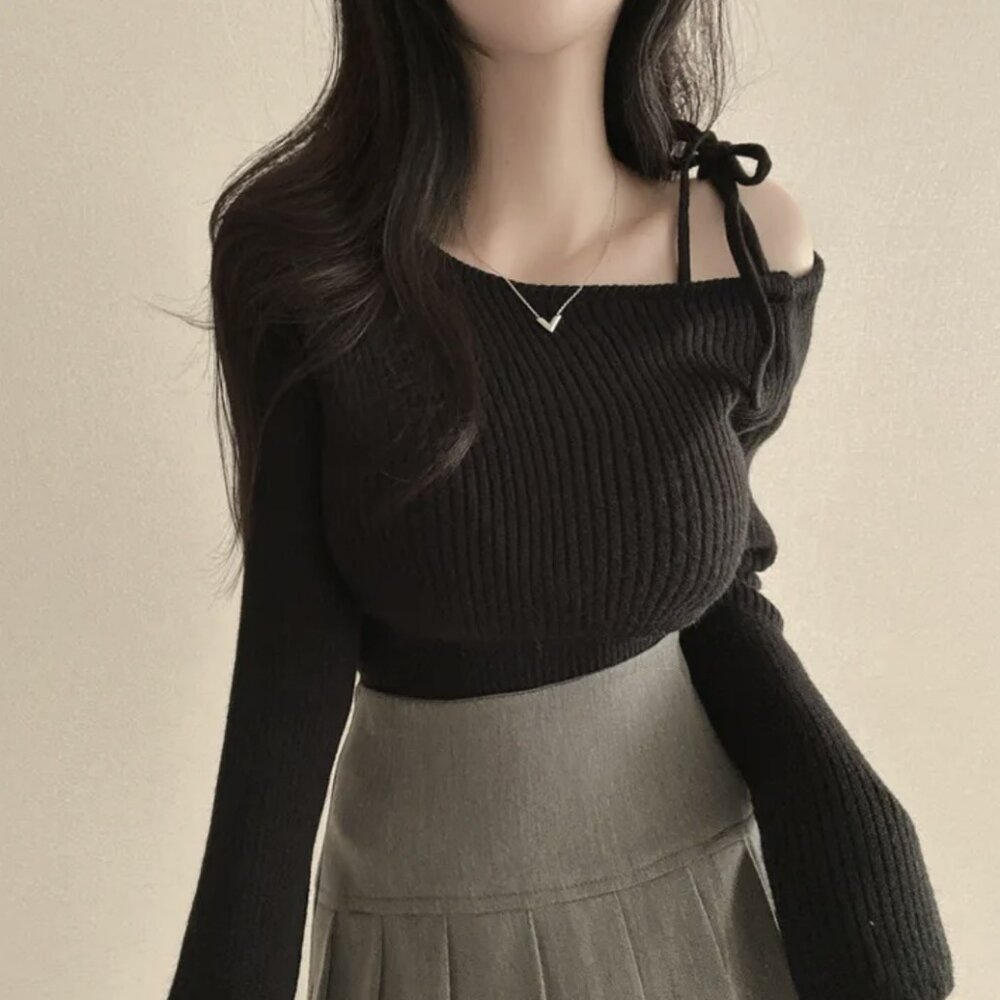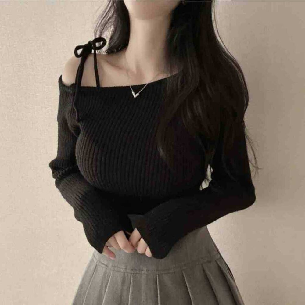 【台灣發貨】韓版氣質斜肩綁帶針織上衣 長袖上衣 長袖t恤 衣服 女裝 上衣【W521】-圖片-1