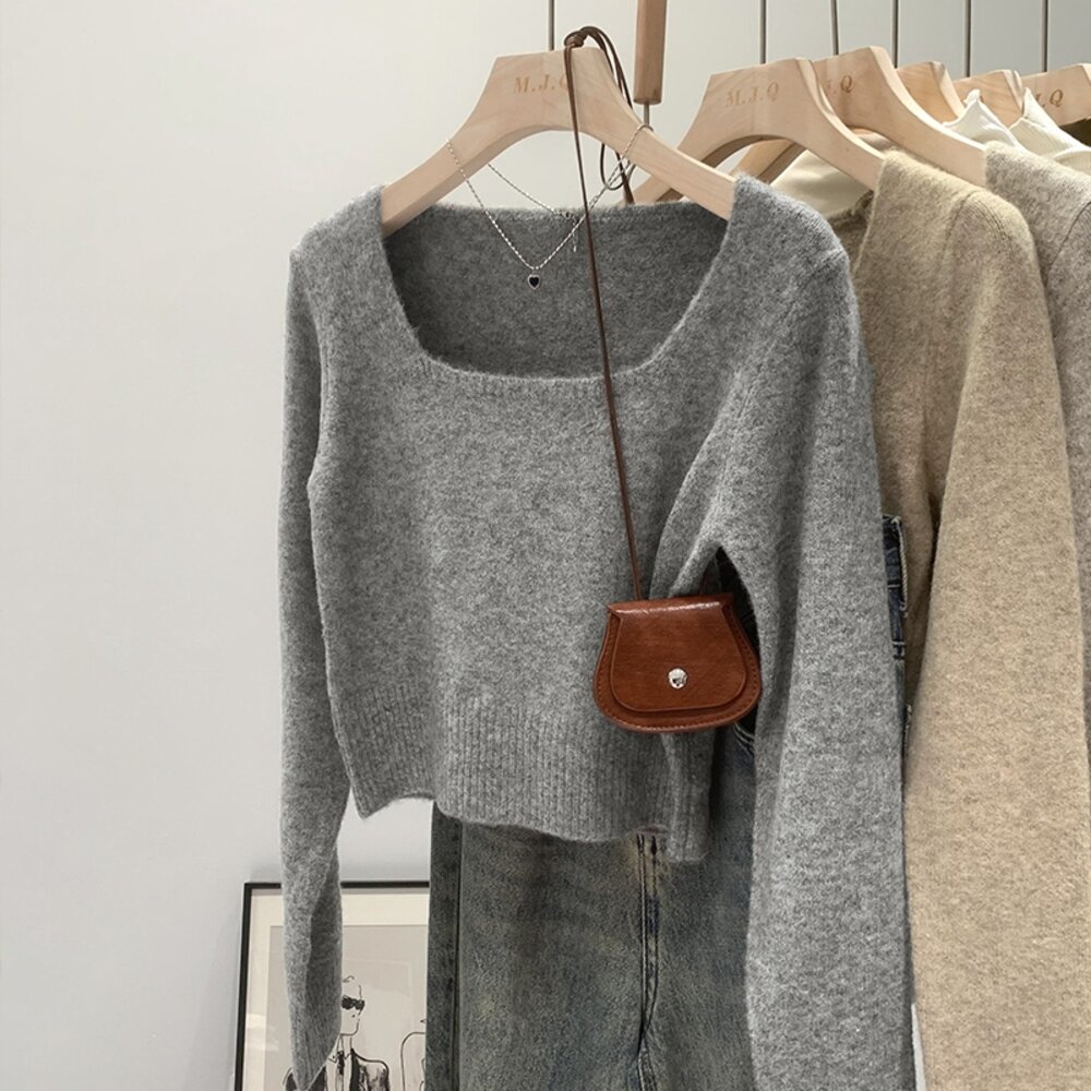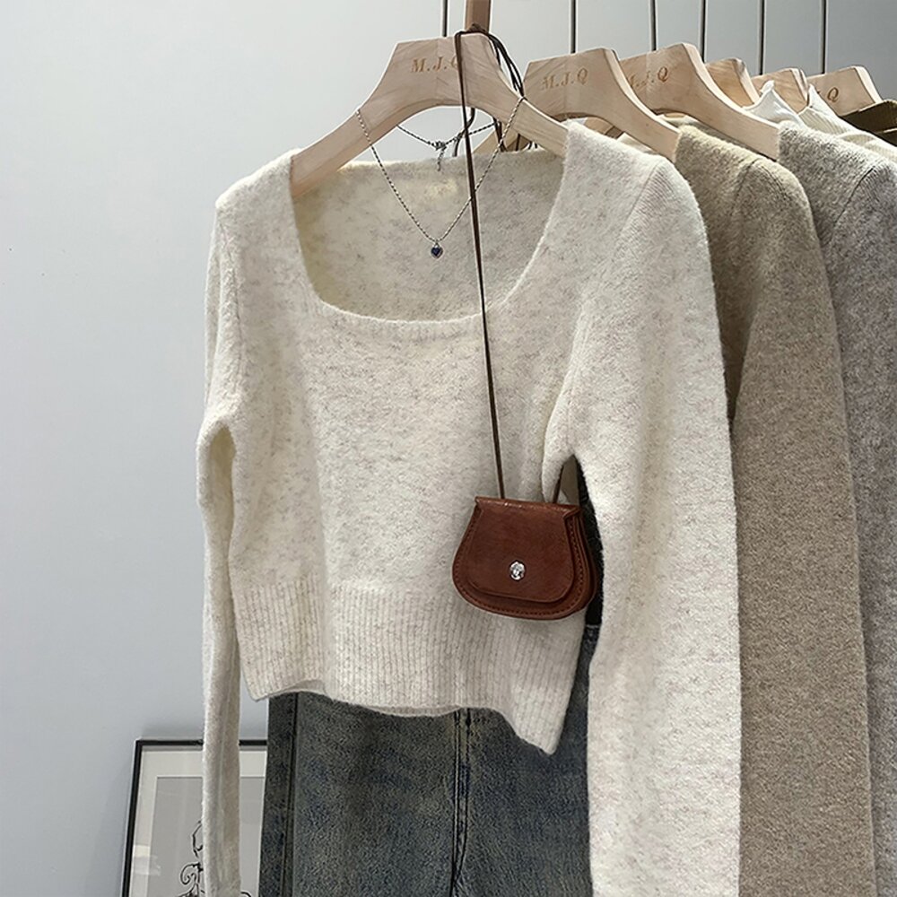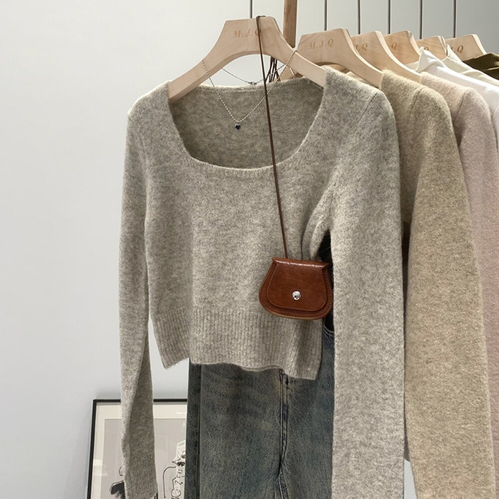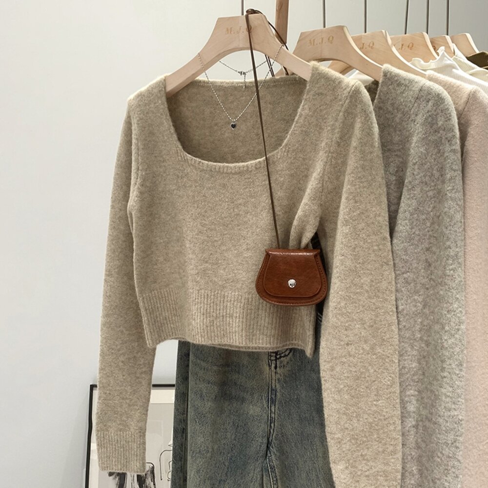 【台灣發貨】韓版方領顯瘦短版毛衣 長袖上衣 長袖t恤 衣服 女裝 上衣【W394】-圖片-1