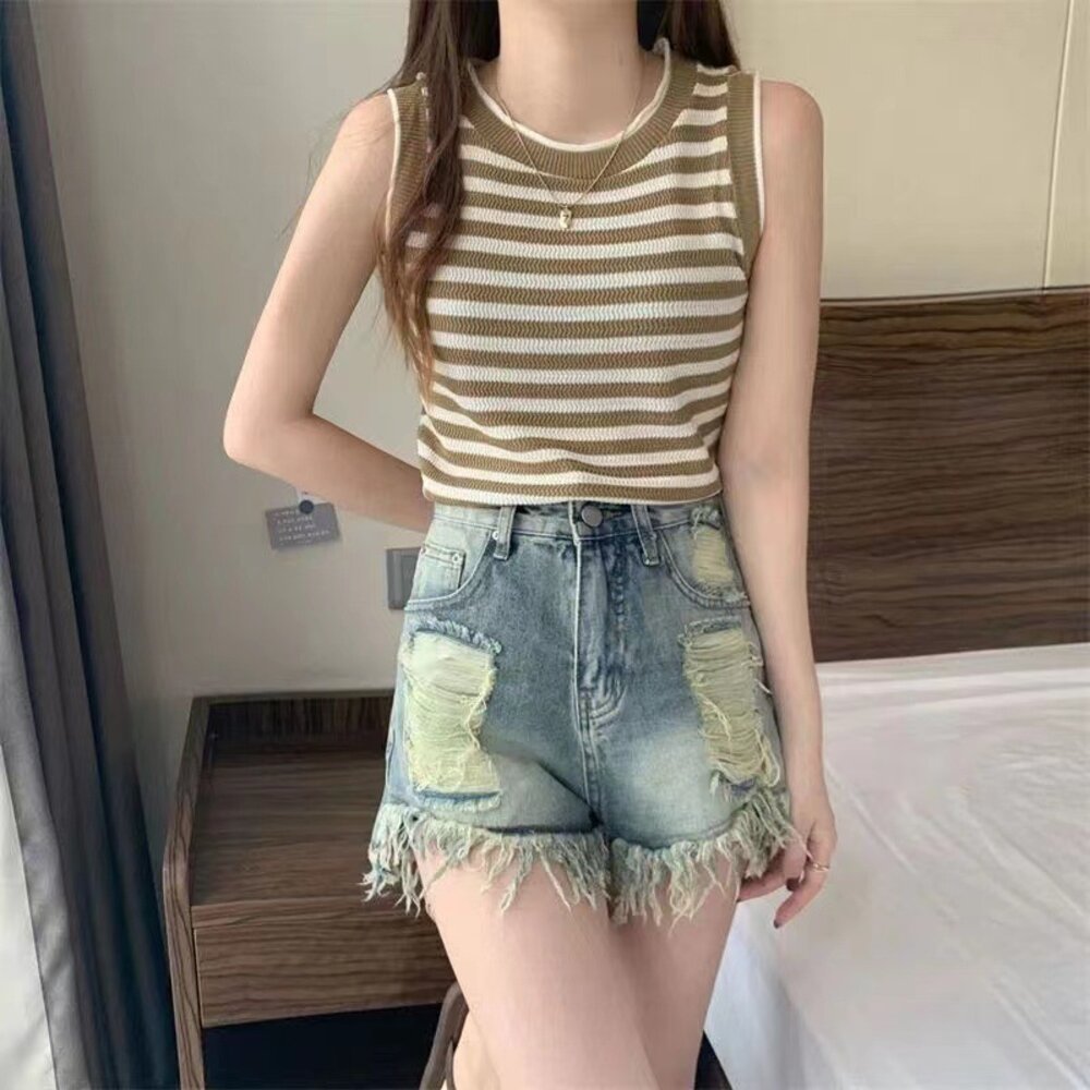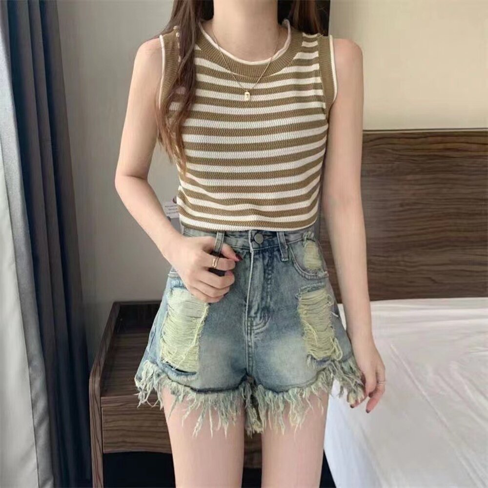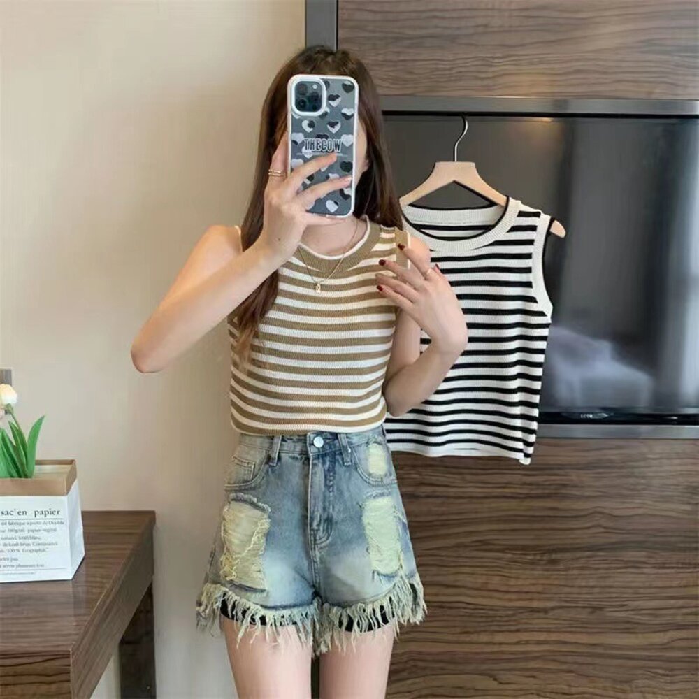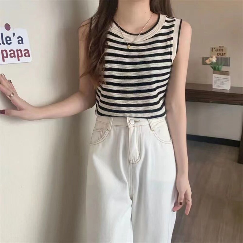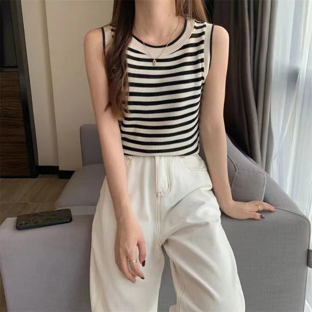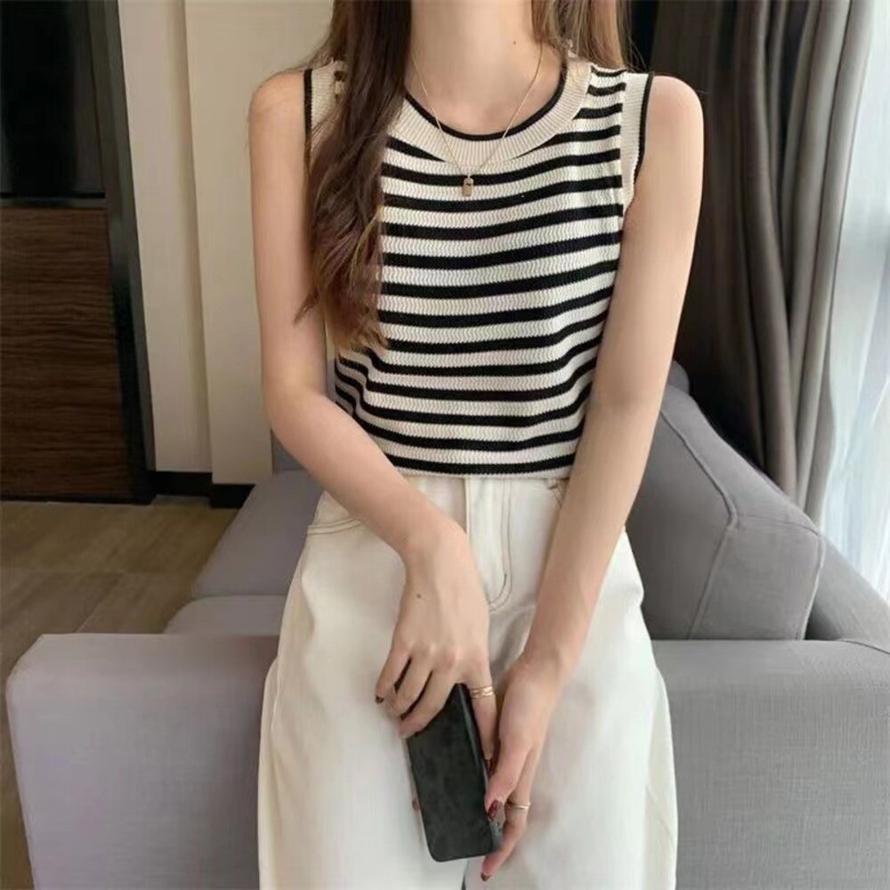 【台灣發貨】韓版條紋顯瘦針織背心 小可愛 背心 衣服 女裝 上衣【V417】-圖片-1