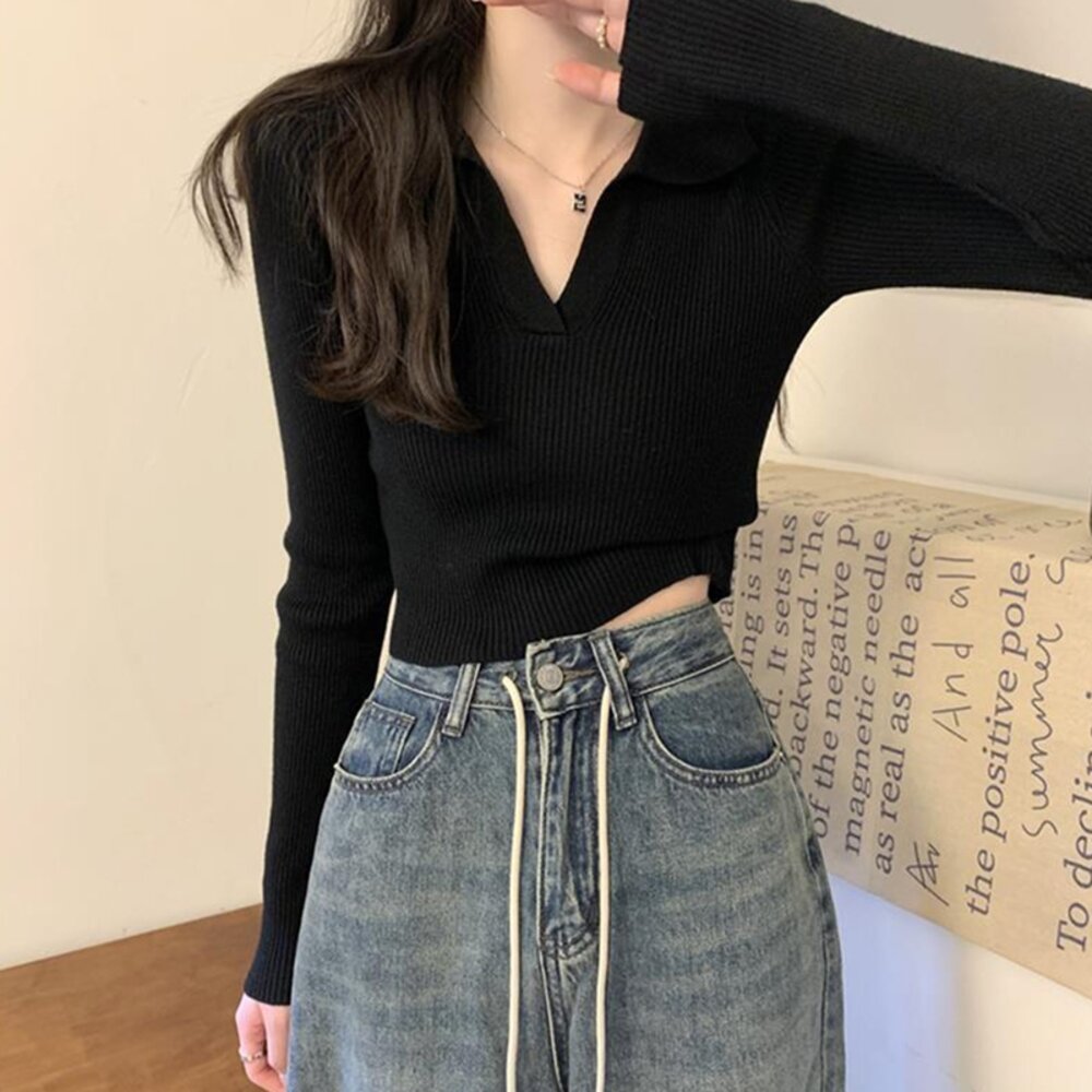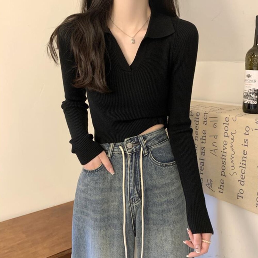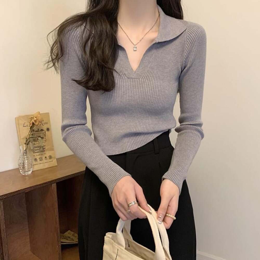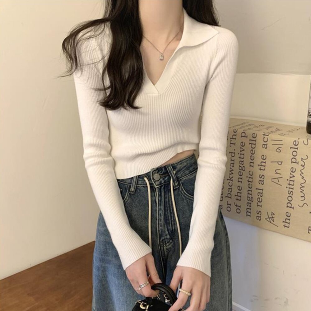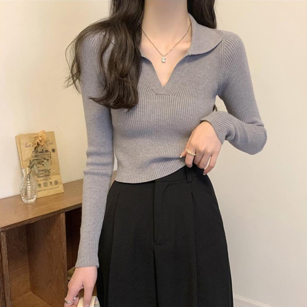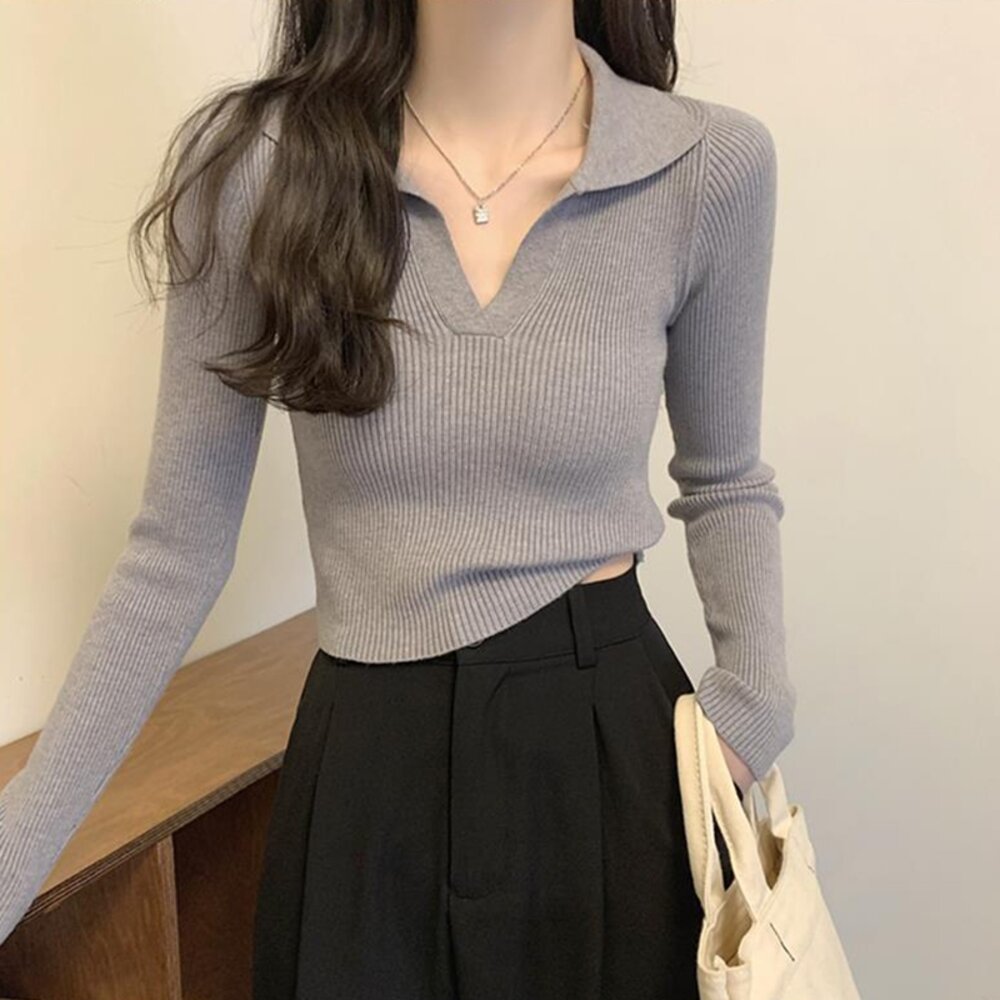 【台灣發貨】韓版設計感V領打底針織上衣 長袖上衣 長袖t恤 衣服 女裝 上衣【W288】-圖片-2