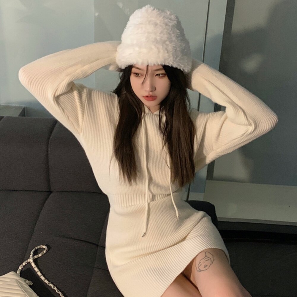 【台灣發貨】韓版修身顯瘦短裙連帽針織連衣裙 套裝 連身裙 吊帶裙 吊帶褲 女裝【S232】-圖片-2
