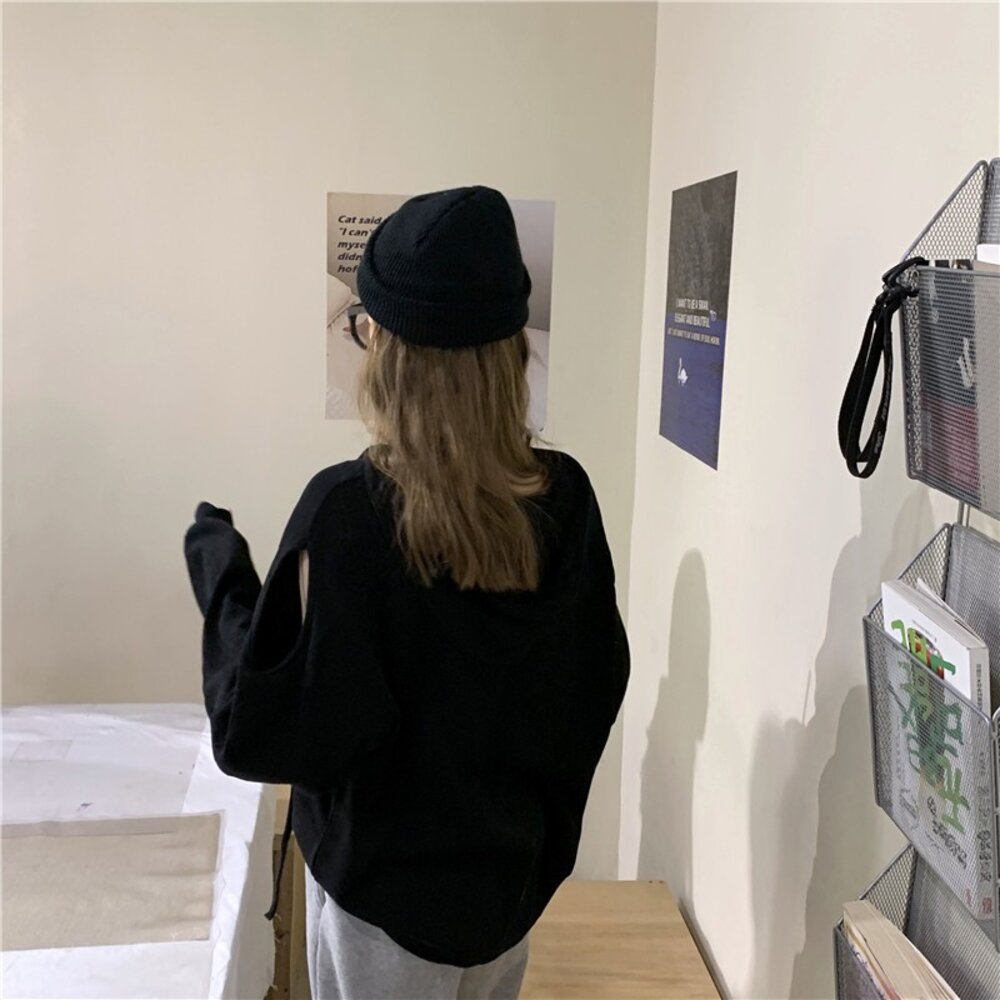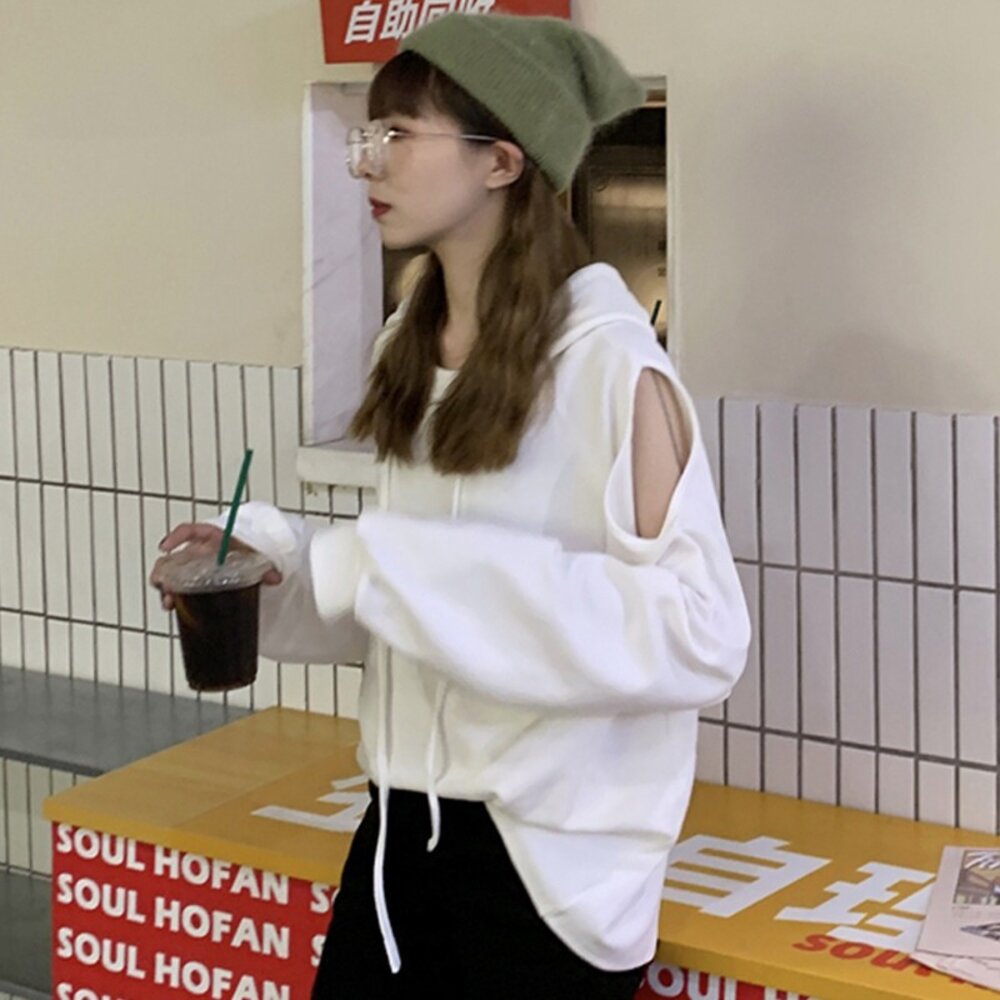 【台灣發貨】韓版設計感寬鬆露肩連帽上衣 長袖上衣 長袖t恤 衣服 女裝 上衣【W569】 封面照片