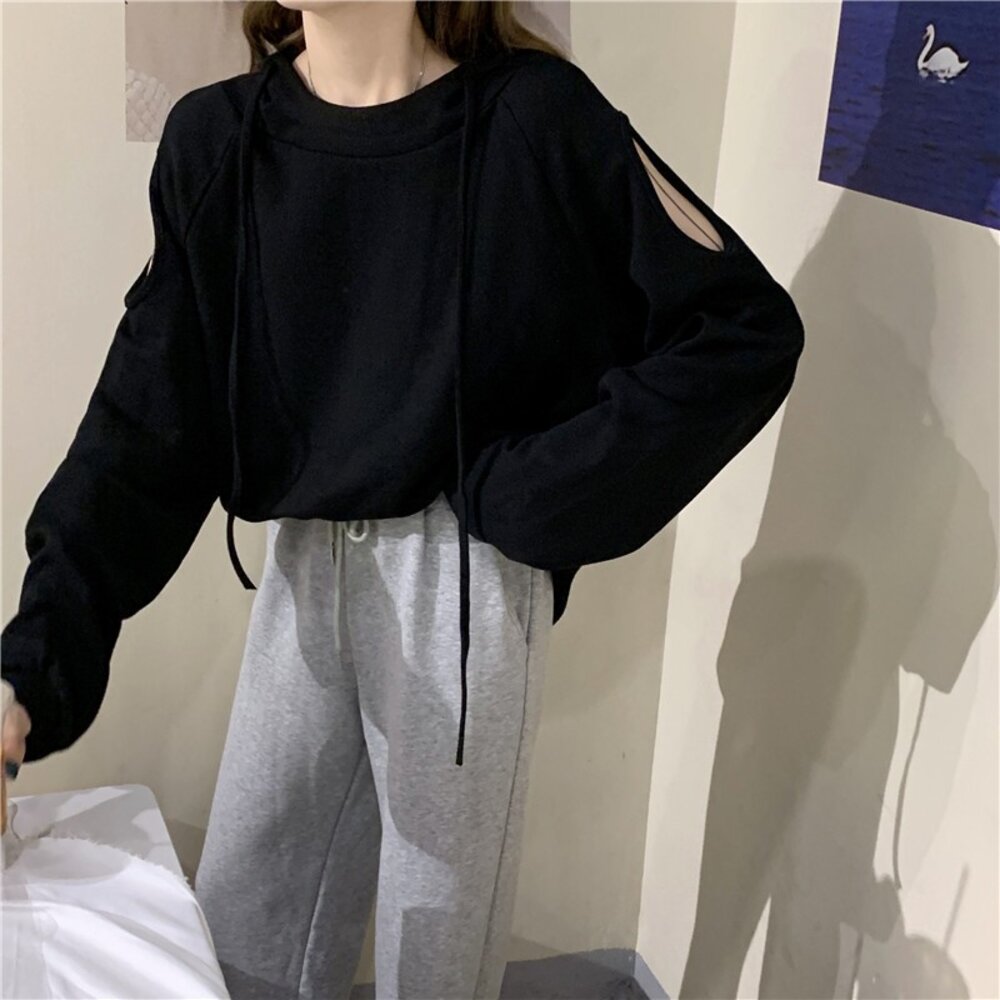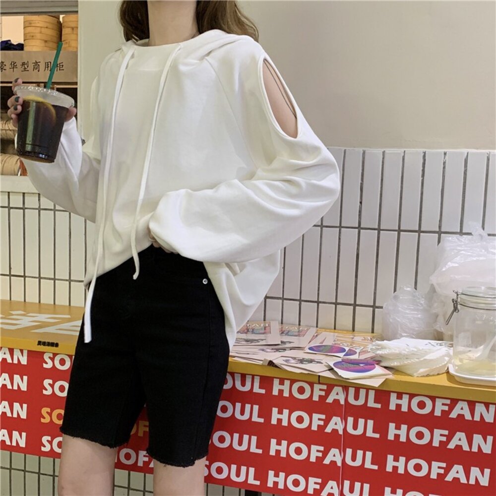 【台灣發貨】韓版設計感寬鬆露肩連帽上衣 長袖上衣 長袖t恤 衣服 女裝 上衣【W569】-圖片-2