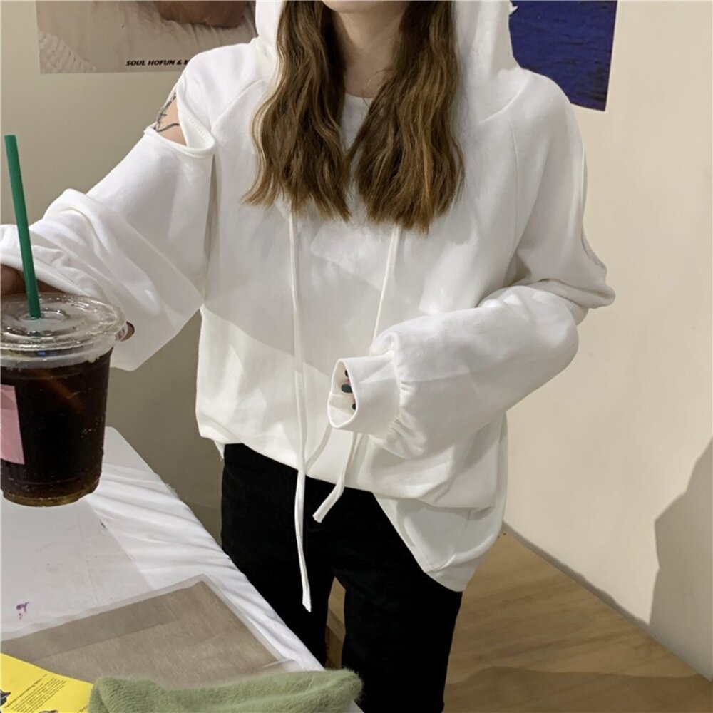 【台灣發貨】韓版設計感寬鬆露肩連帽上衣 長袖上衣 長袖t恤 衣服 女裝 上衣【W569】-圖片-6