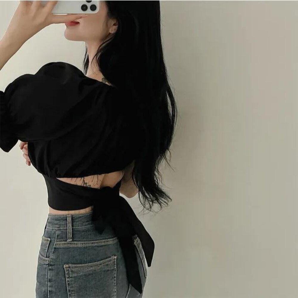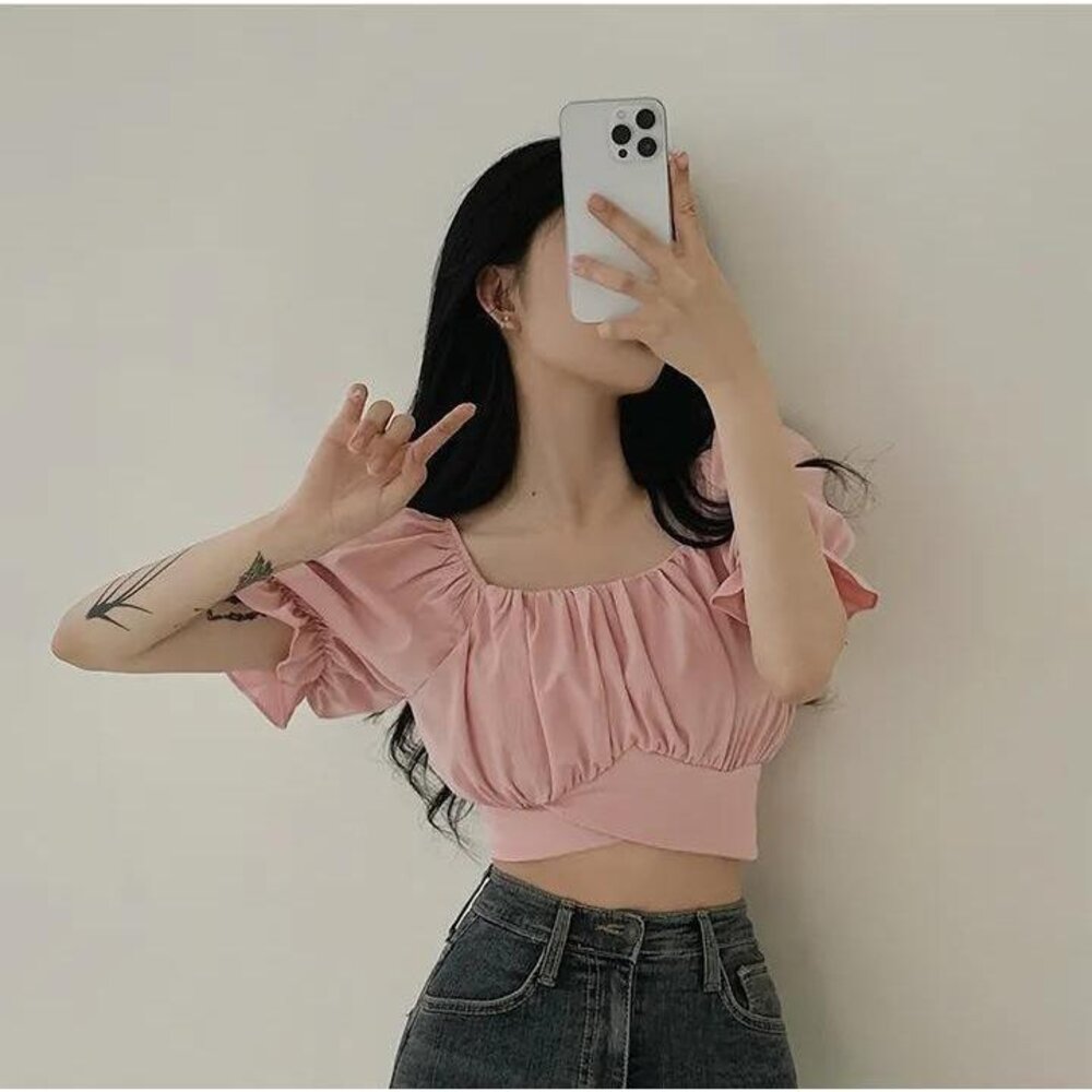 【台灣發貨】韓版交叉皺褶綁帶短版上衣 衣服 女裝 t恤 短袖t恤 上衣【T615】-圖片-7