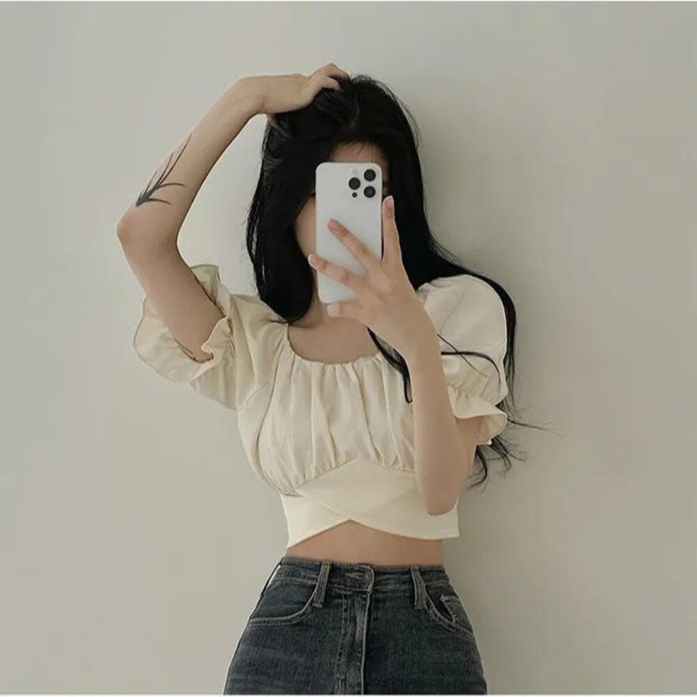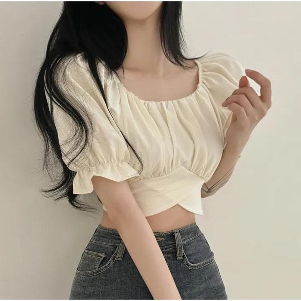 【台灣發貨】韓版交叉皺褶綁帶短版上衣 衣服 女裝 t恤 短袖t恤 上衣【T615】-圖片-1