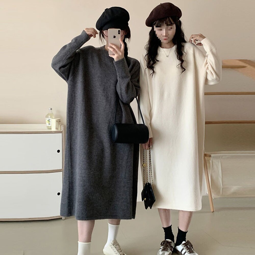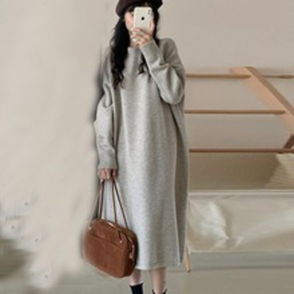 【台灣發貨】韓版氣質圓領寬鬆休閒長袖針織洋裝 連身裙 吊帶裙 吊帶褲 女裝【S350】-圖片-4