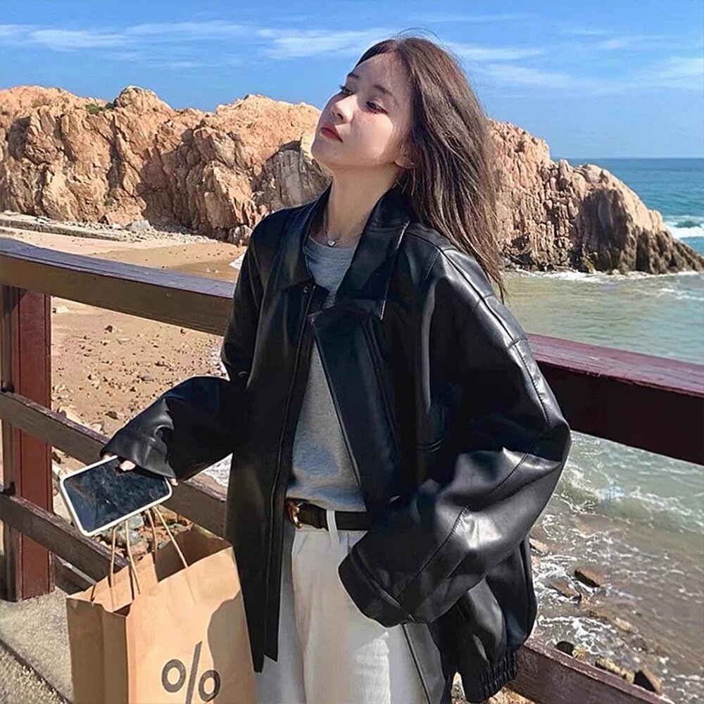 【台灣發貨】韓版甜酷寬鬆皮外套 外套 防曬外套 女裝 上衣 衣服【J382】-圖片-1