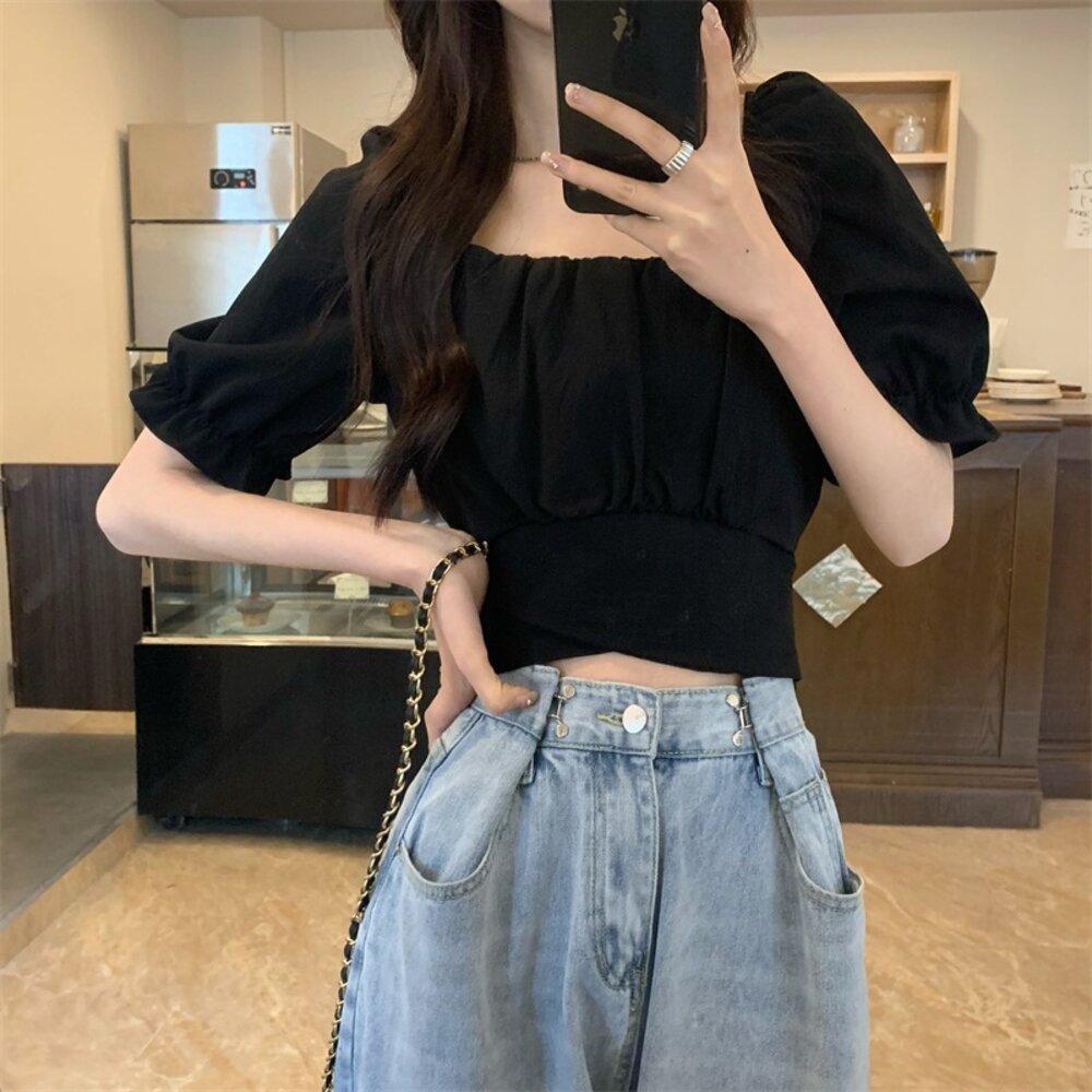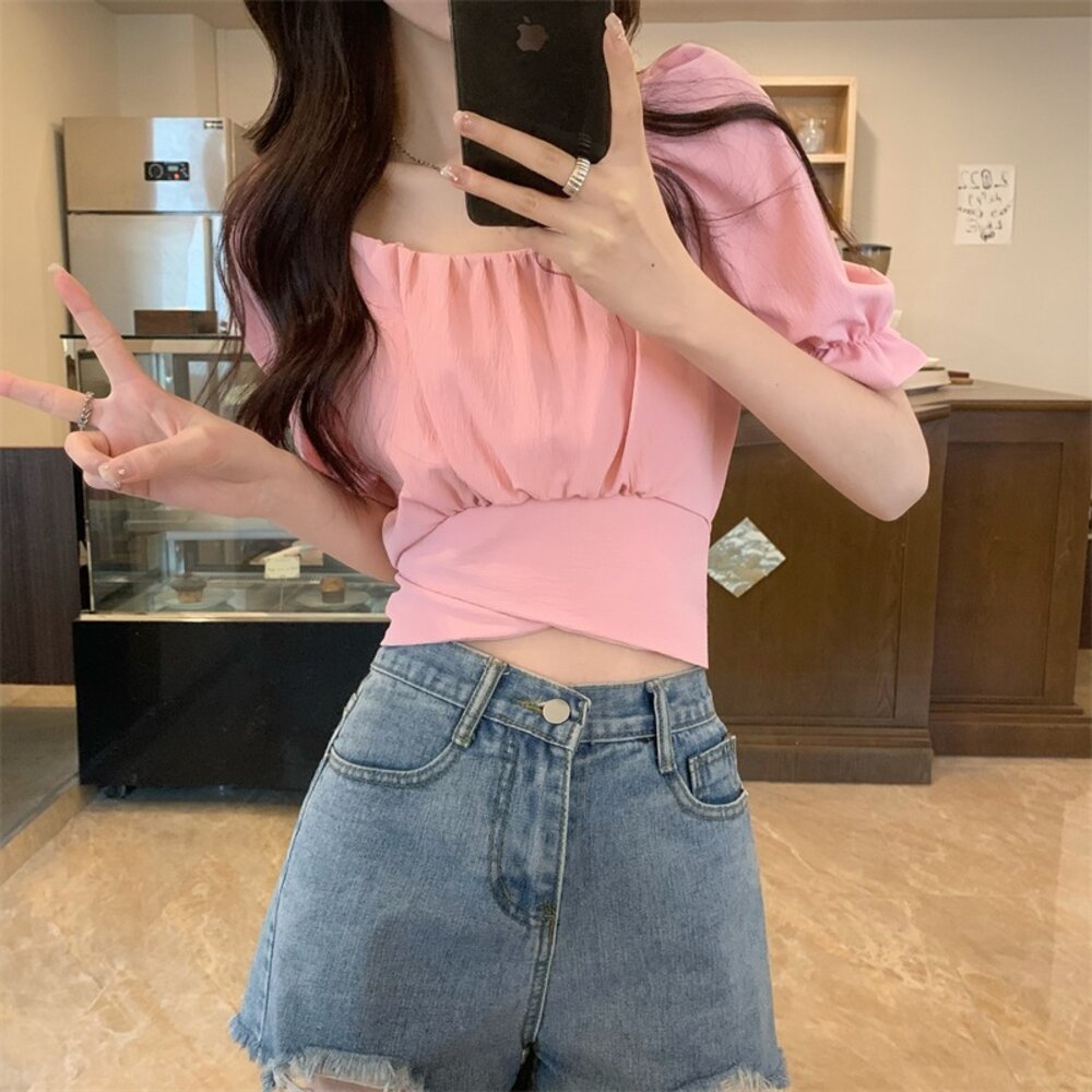【台灣發貨】韓版設計感短版露背綁帶襯衫 衣服 女裝 t恤 短袖t恤 上衣【T615】-圖片-8