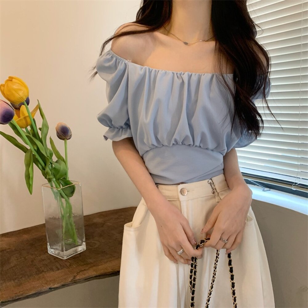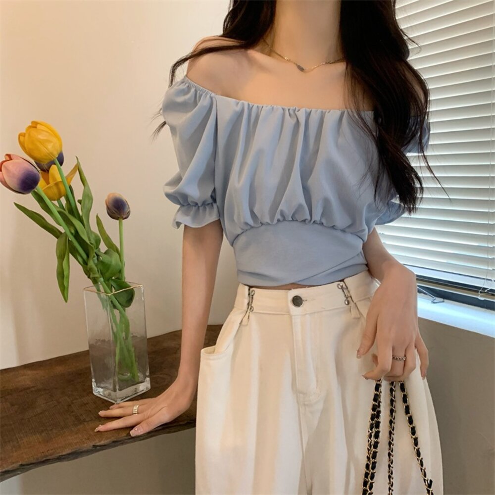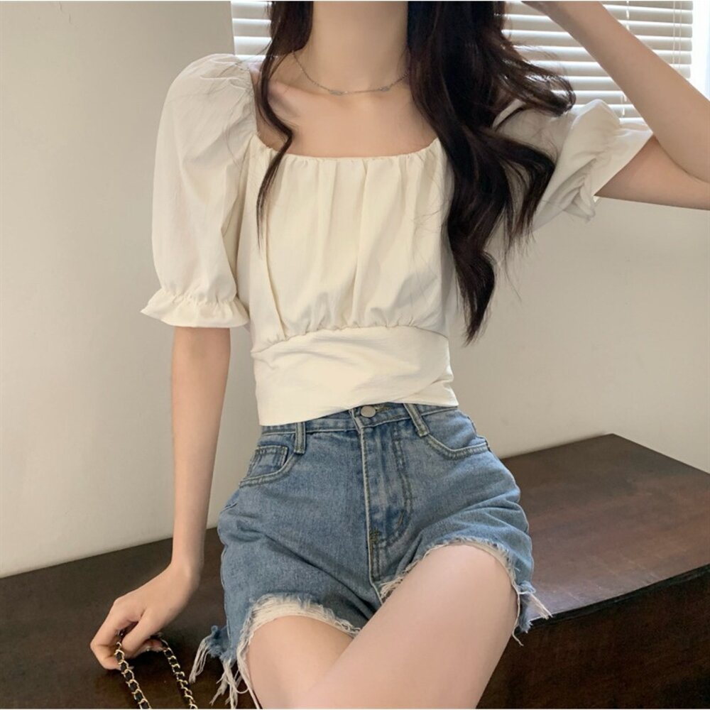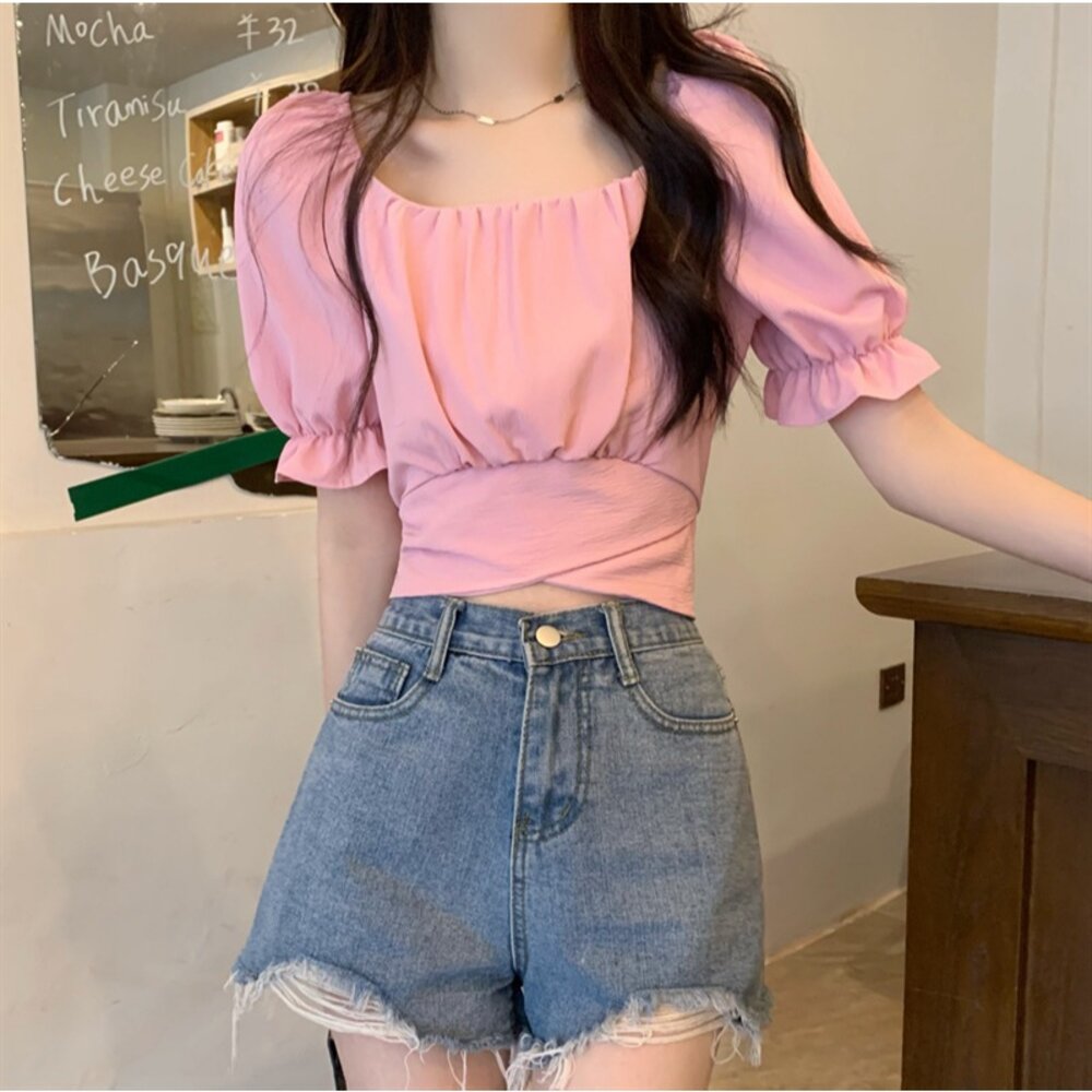 【台灣發貨】韓版設計感短版露背綁帶襯衫 衣服 女裝 t恤 短袖t恤 上衣【T615】-圖片-1