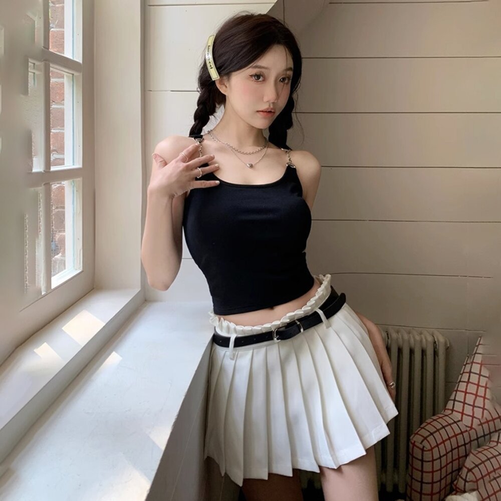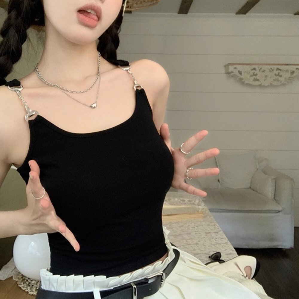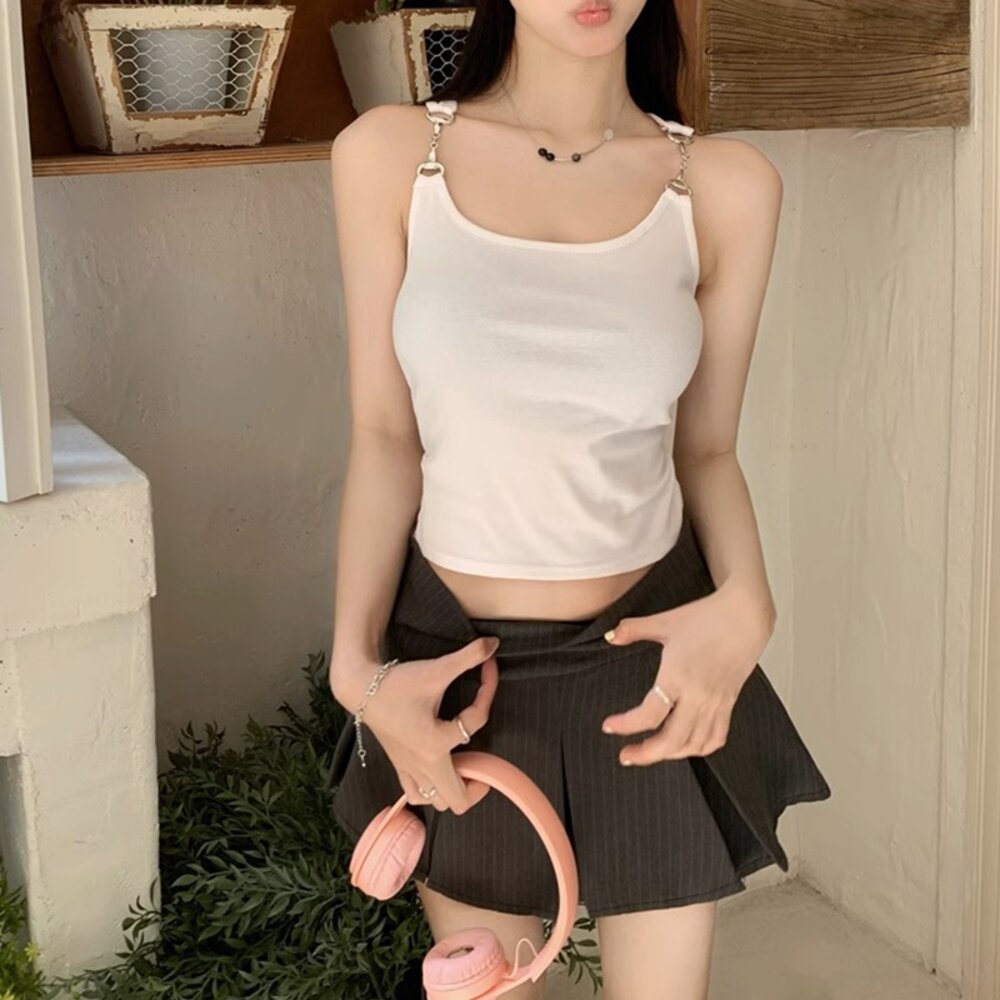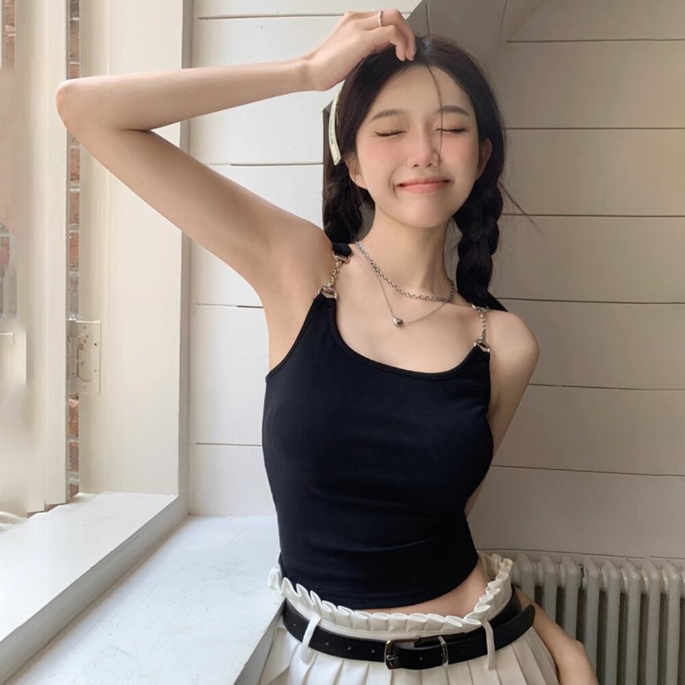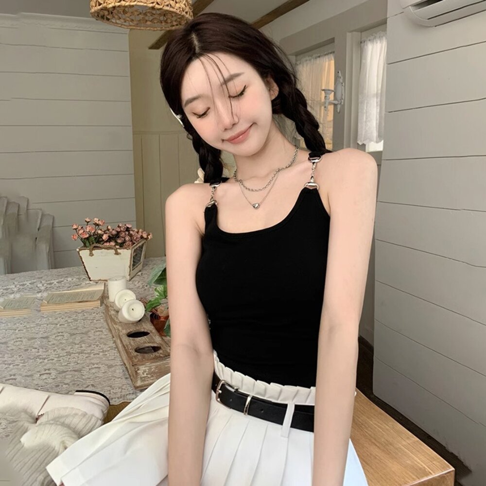 【台灣發貨】韓版金屬扣肩帶吊帶短版背心 帶胸墊免穿內衣 小可愛 背心 衣服 女裝 上衣【V382】-圖片-1