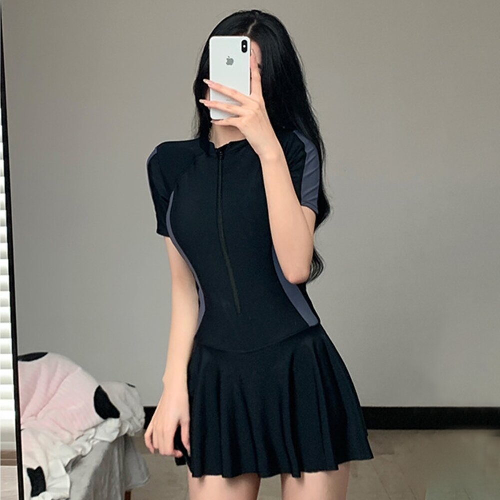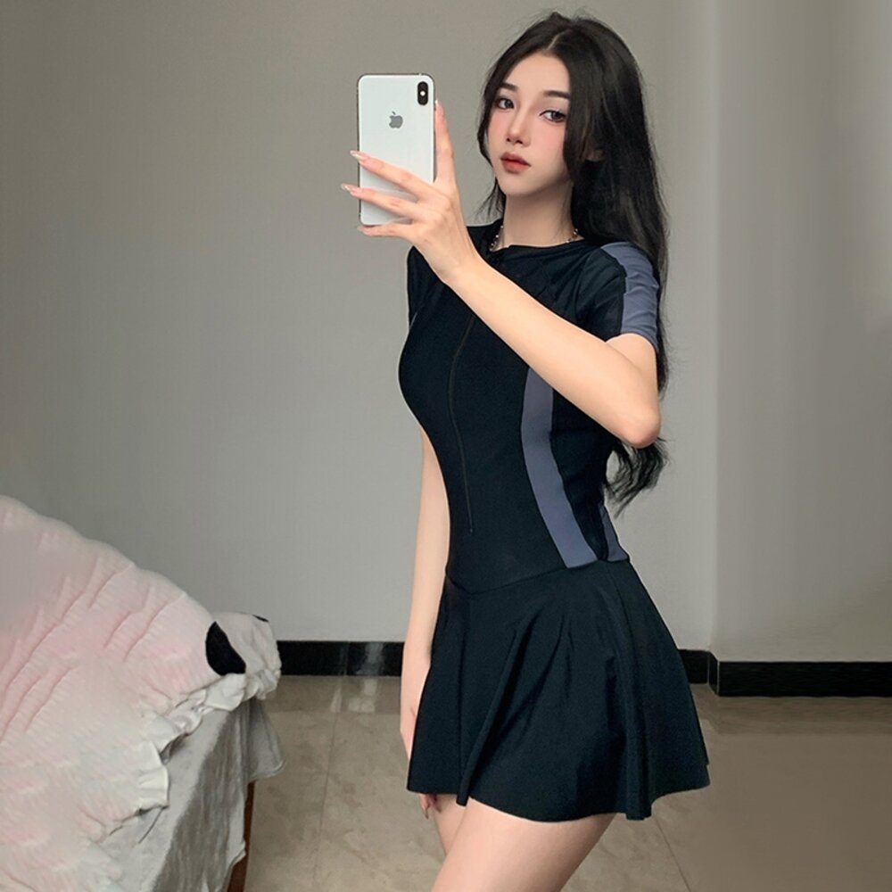 【台灣發貨】韓版運動風收腰顯瘦連身泳衣 帶胸墊 連身裙 吊帶裙 吊帶褲 女裝【S133】-圖片-3