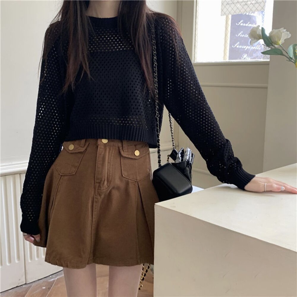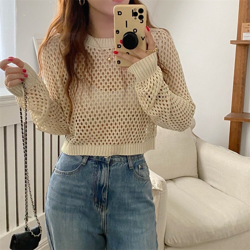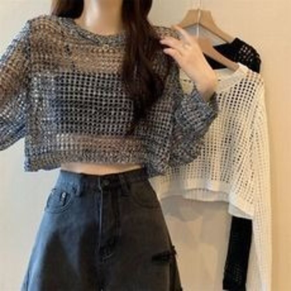【台灣發貨】韓版氣質鏤空防曬上衣 長袖上衣 長袖t恤 衣服 女裝 上衣【W528】-圖片-1