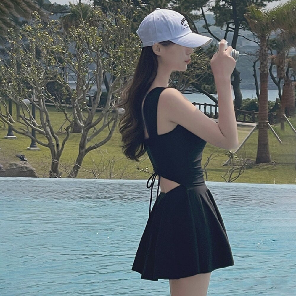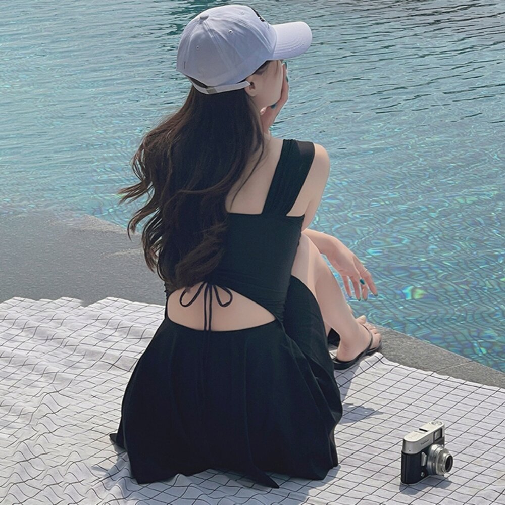 【台灣發貨】韓版顯瘦V領露背百褶裙連身泳衣【S133】-圖片-5