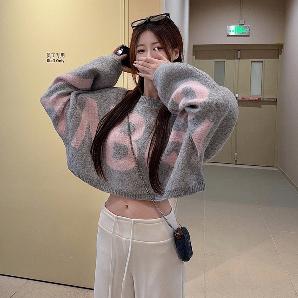 【台灣發貨】韓版慵懶日常字母短版針織上衣 長袖上衣 長袖t恤 衣服 女裝 上衣【W698】-圖片-1