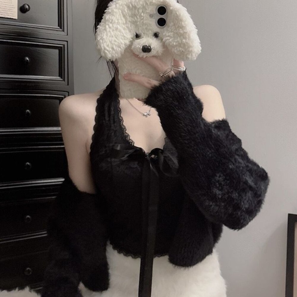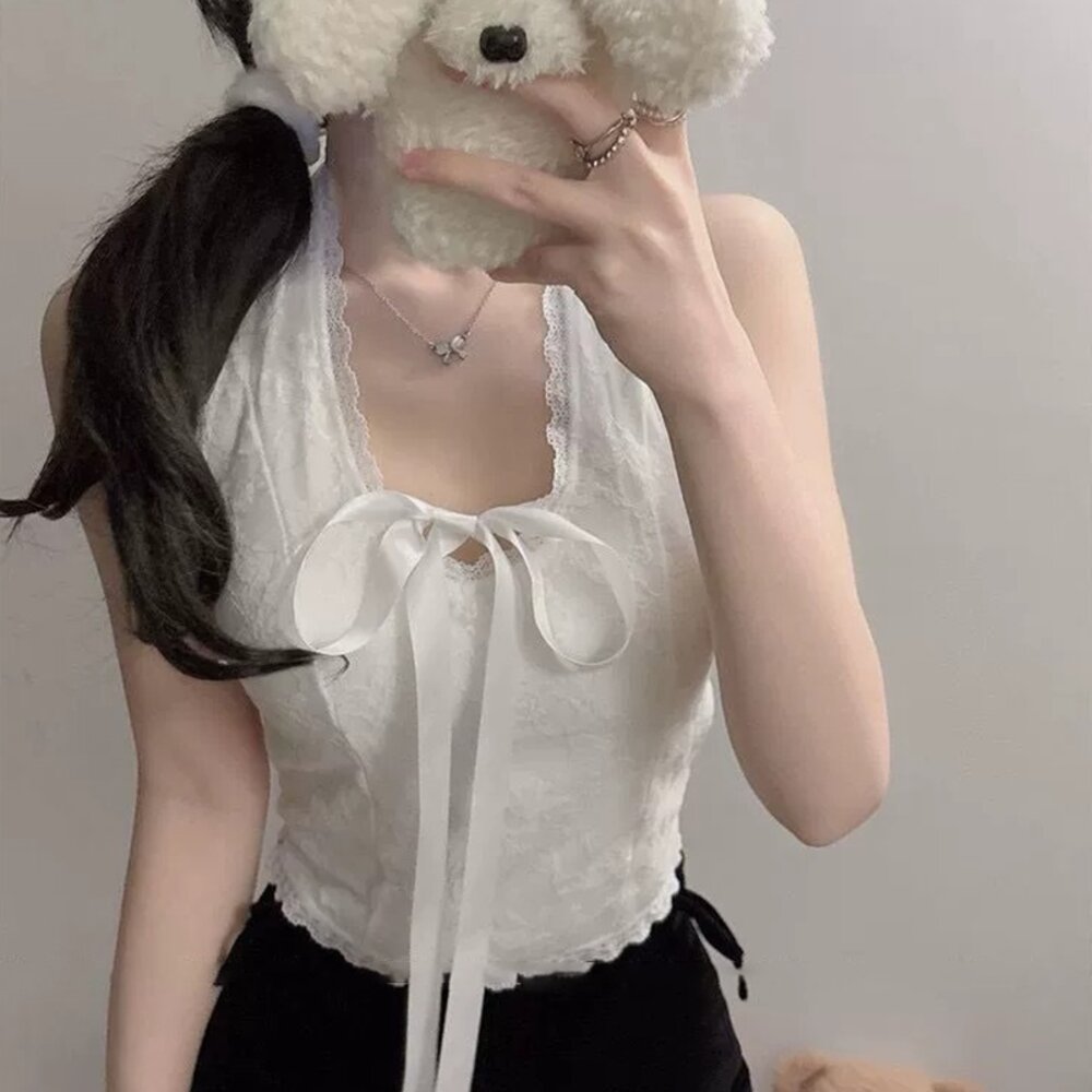 【台灣發貨】韓版蝴蝶結V領短版背心 帶胸墊免穿內衣 小可愛 背心 衣服 女裝 上衣【V434】-圖片-2