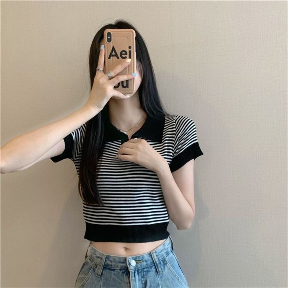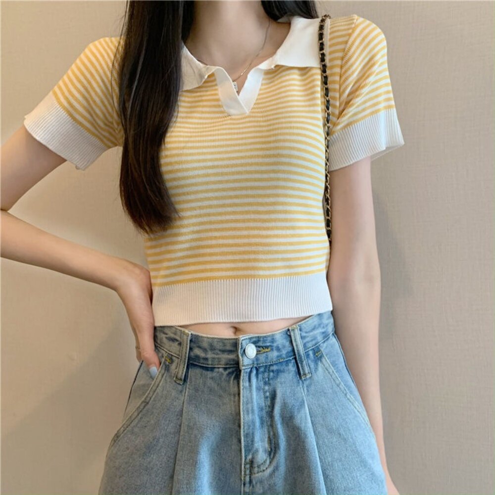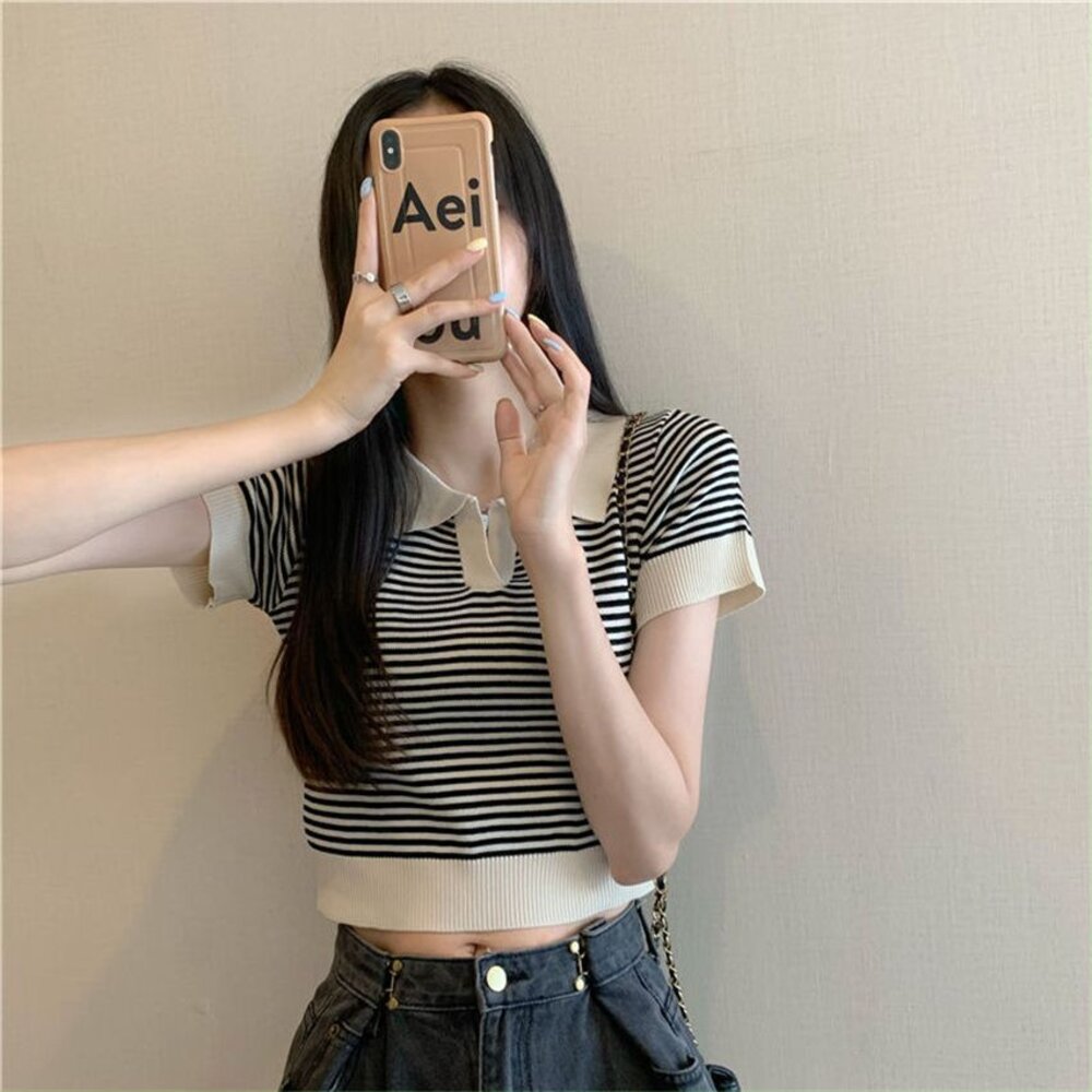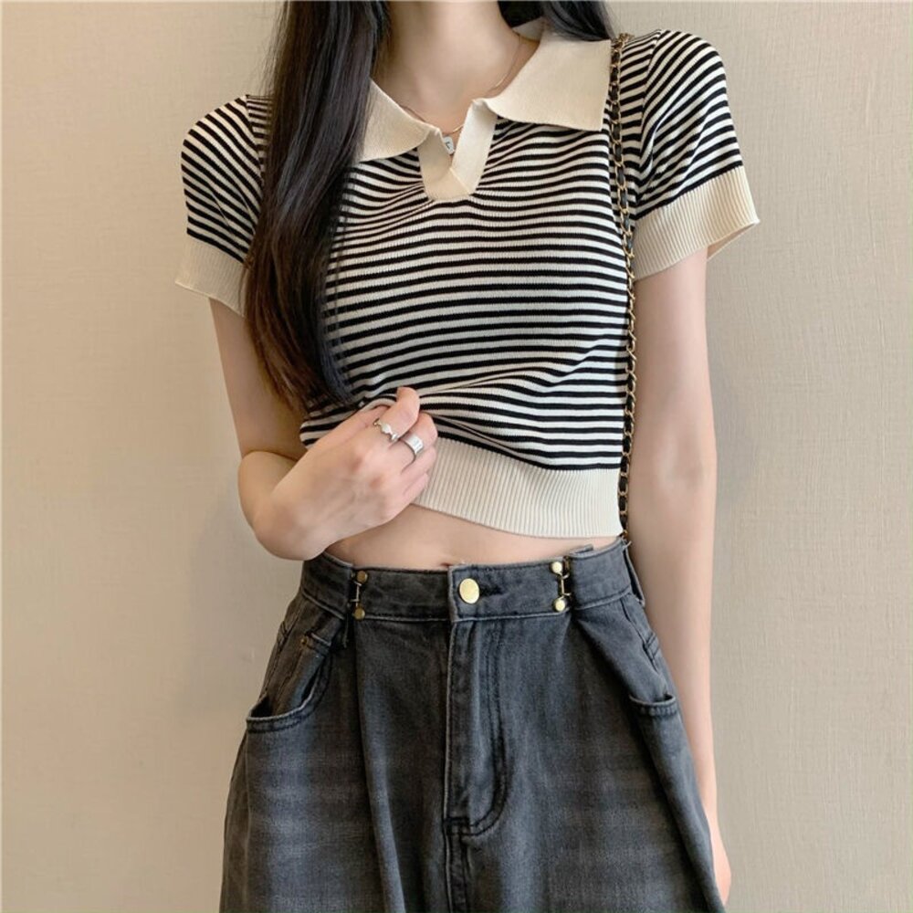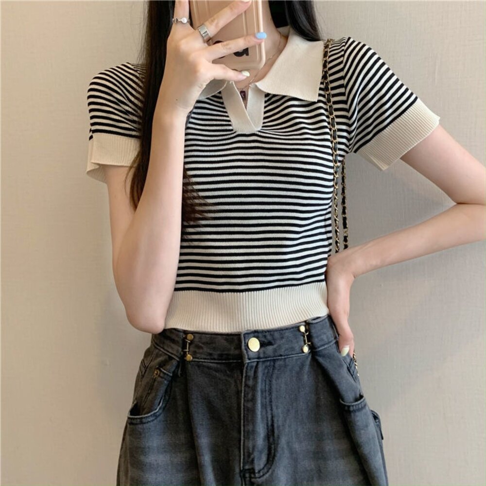 【台灣發貨】韓版翻領條紋針織上衣 衣服 女裝 t恤 短袖t恤 上衣【T650】-圖片-1