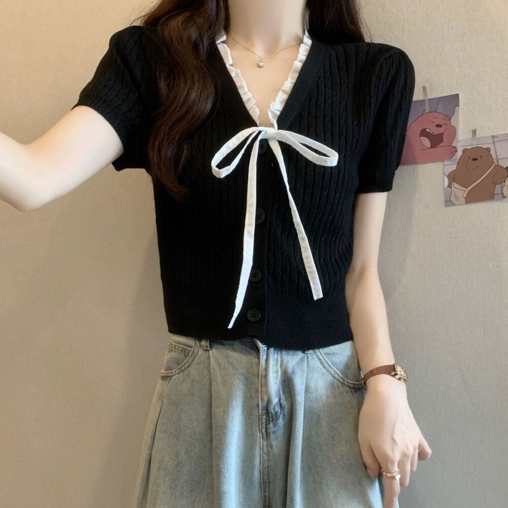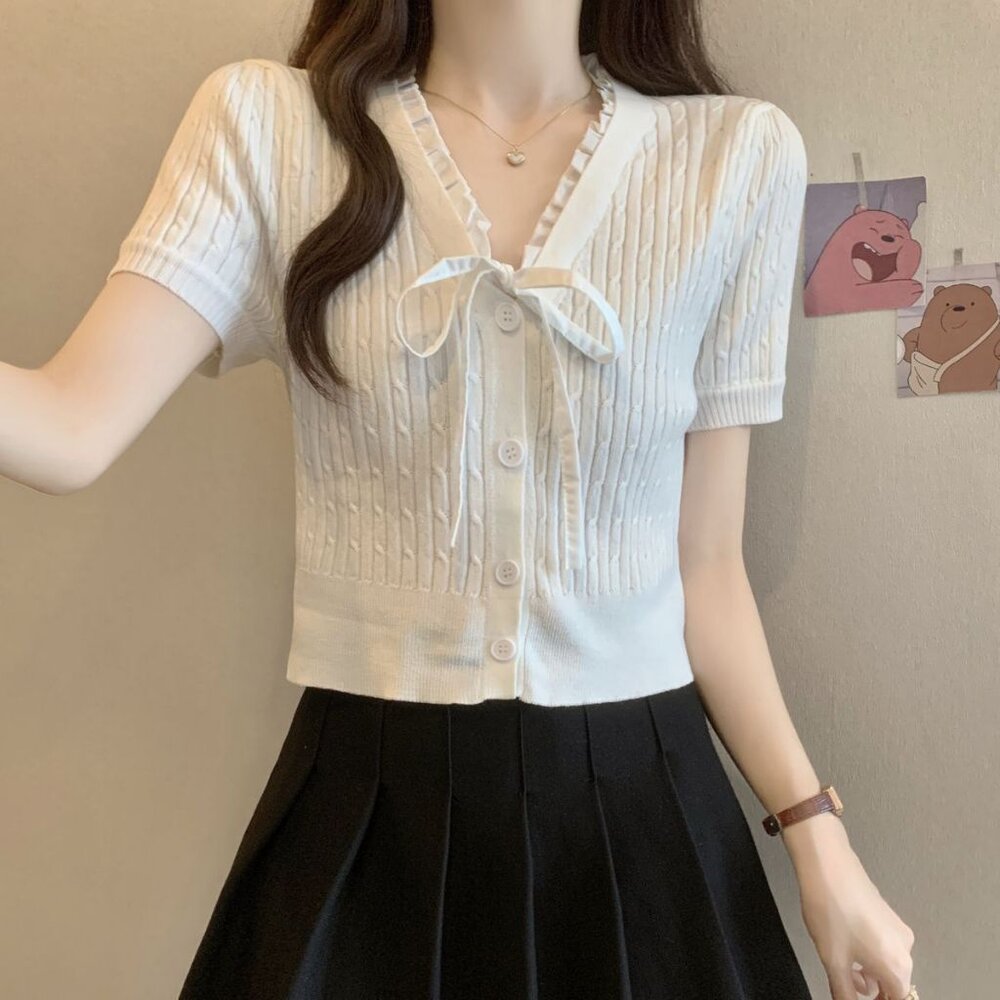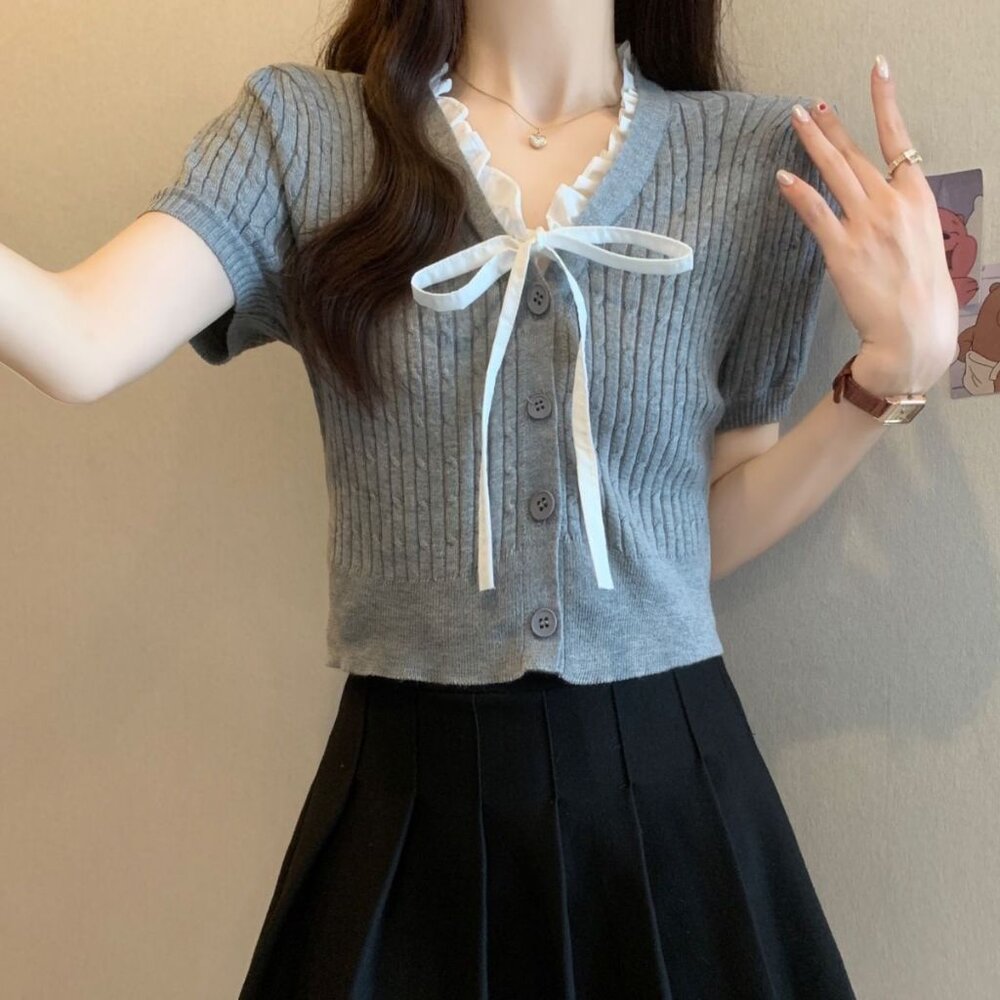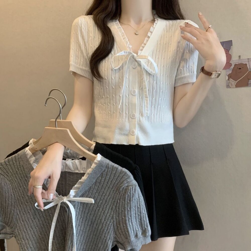 【台灣發貨】韓版氣質花邊綁帶針織上衣 衣服 女裝 t恤 短袖t恤 上衣【T649】-圖片-1