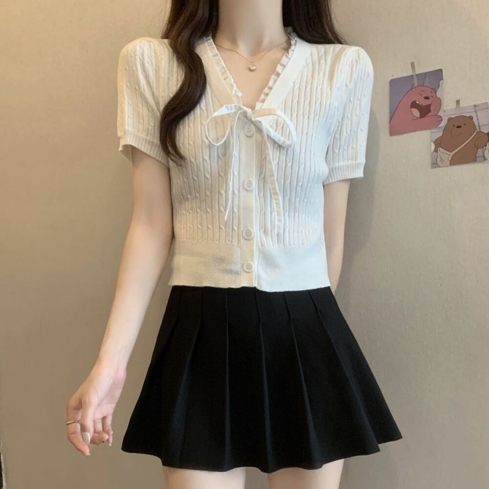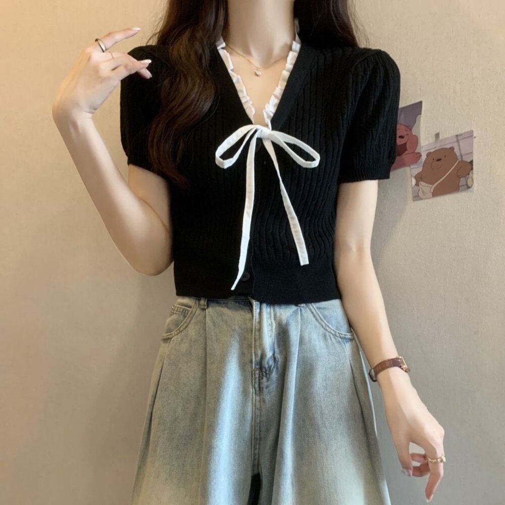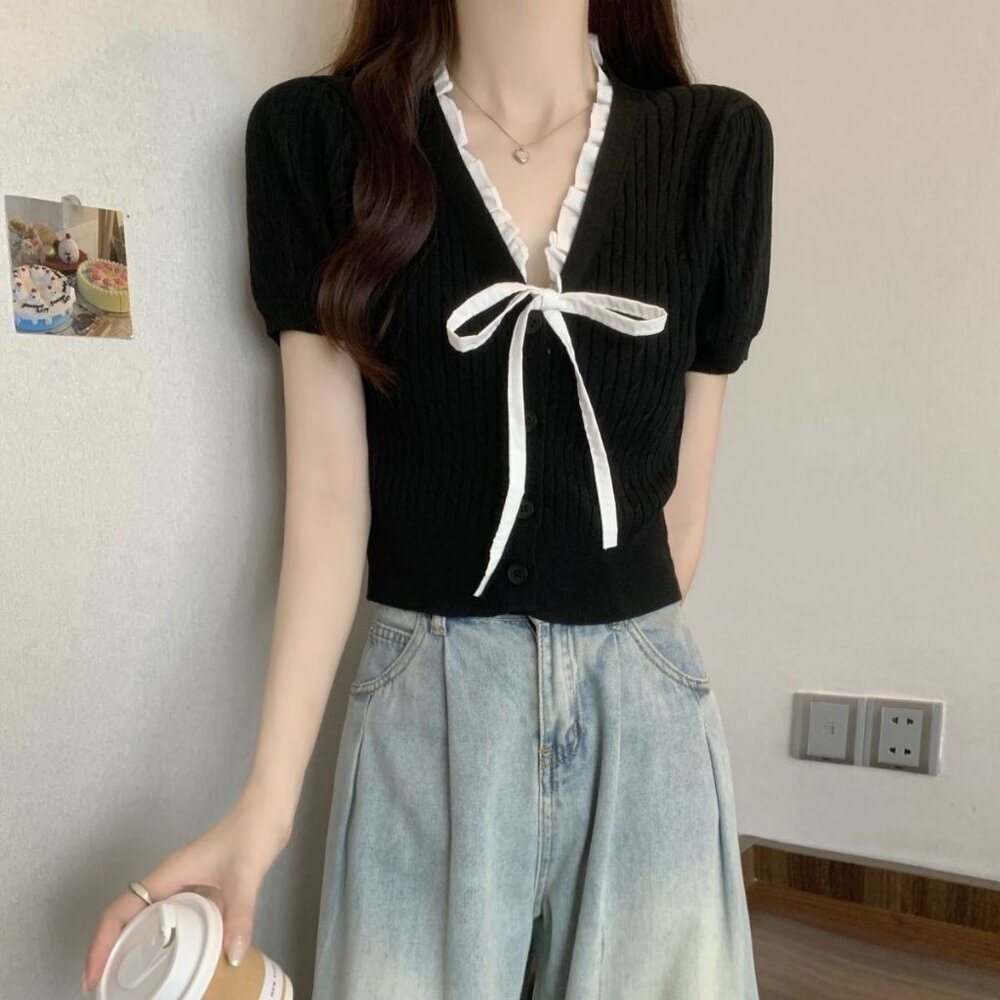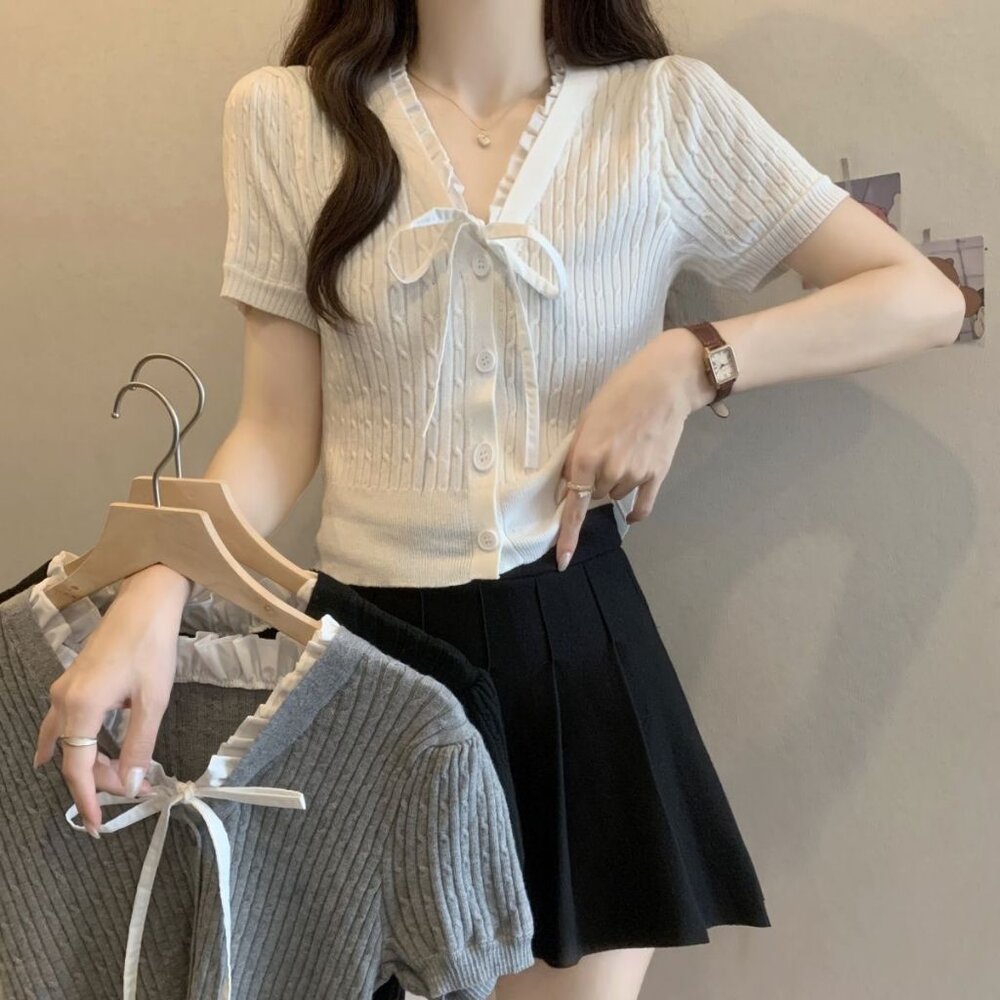 【台灣發貨】韓版氣質花邊綁帶針織上衣 衣服 女裝 t恤 短袖t恤 上衣【T649】-圖片-1