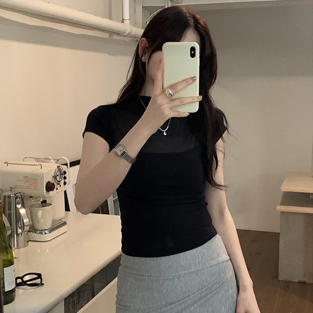 【台灣發貨】韓版黑色網紗微透短袖上衣 衣服 女裝 t恤 短袖t恤 上衣【T655】-圖片-1