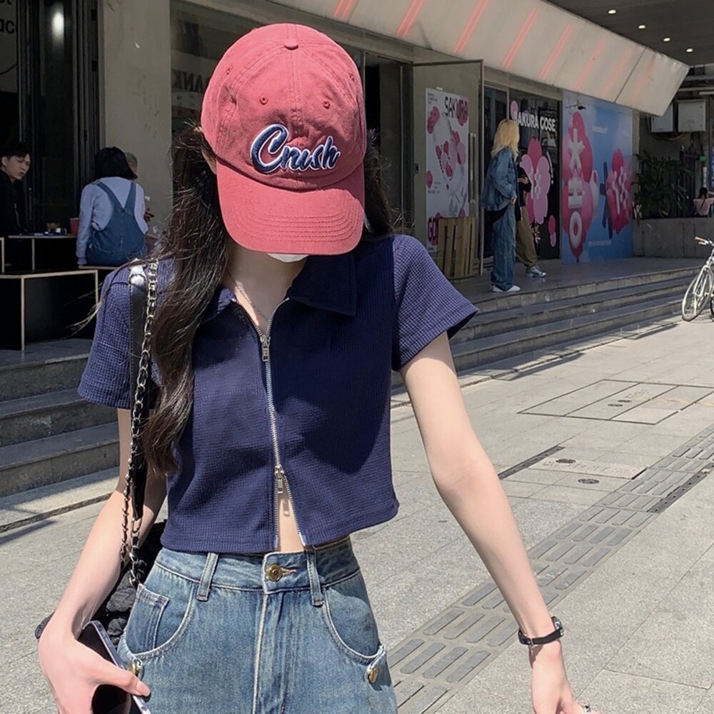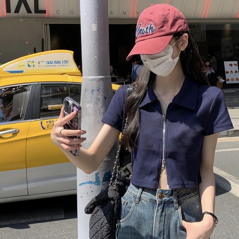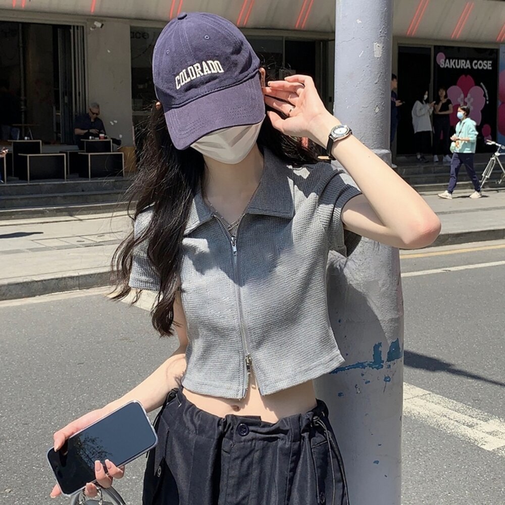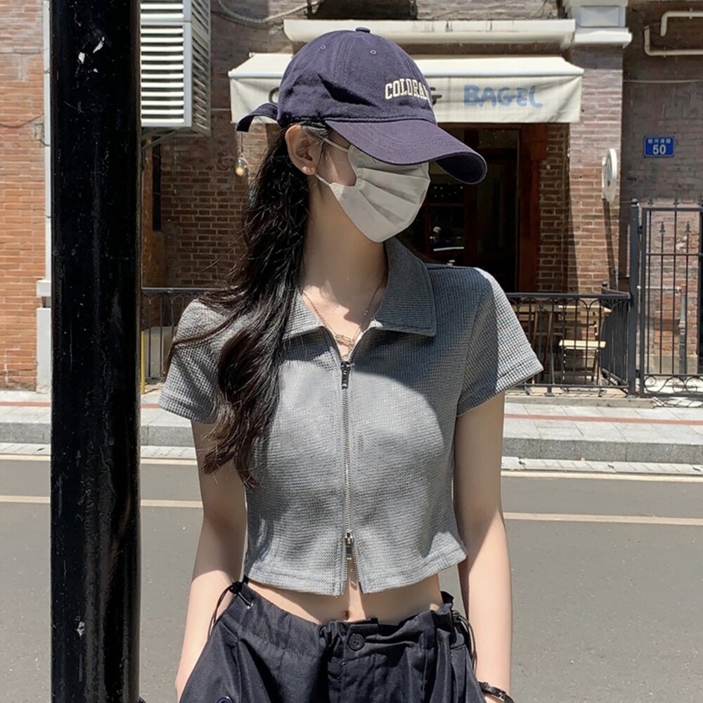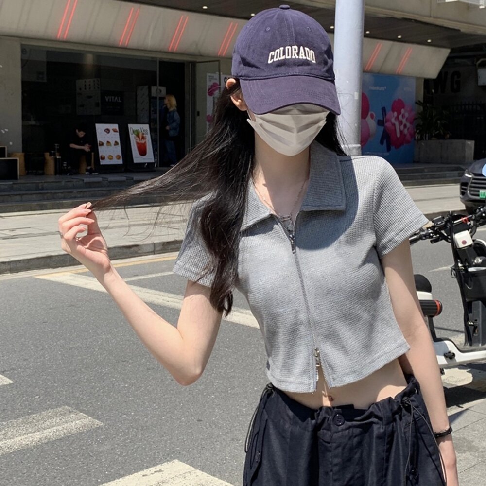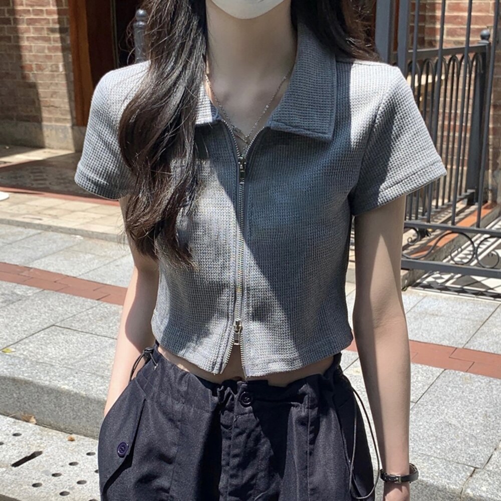 【台灣發貨】韓版翻領設計感雙拉鍊短版上衣 衣服 女裝 t恤 短袖t恤 上衣【T526】-圖片-1