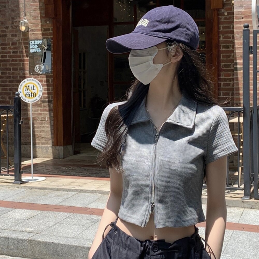 【台灣發貨】韓版翻領設計感雙拉鍊短版上衣 衣服 女裝 t恤 短袖t恤 上衣【T526】-圖片-7