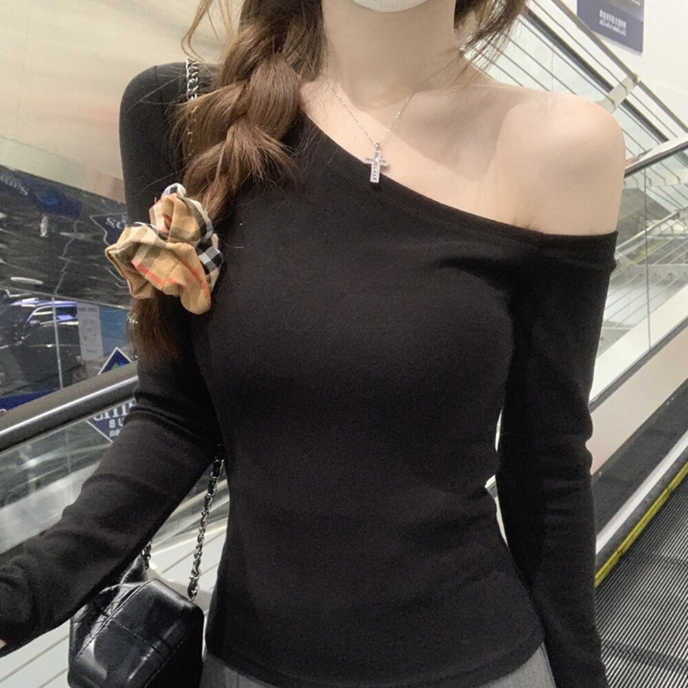 【台灣發貨】韓版氣質斜肩長袖上衣 長袖上衣 長袖t恤 衣服 女裝 上衣【W654】-圖片-1