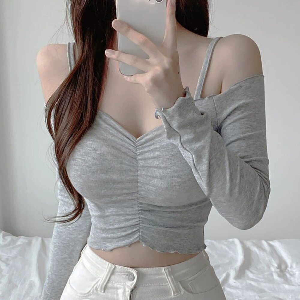 【台灣發貨】韓版設計感一字領短版上衣 長袖上衣 長袖t恤 衣服 女裝 上衣【W613】-圖片-2
