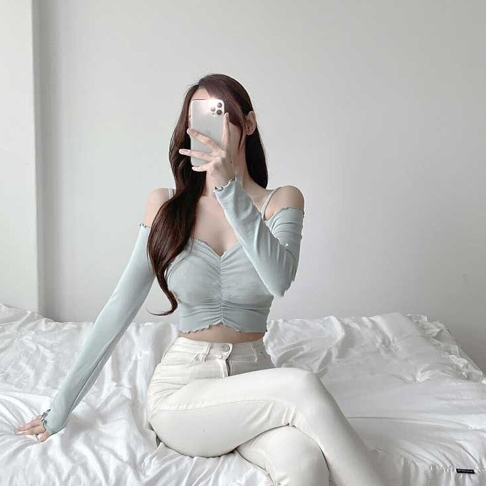 【台灣發貨】韓版設計感一字領短版上衣 長袖上衣 長袖t恤 衣服 女裝 上衣【W613】-圖片-8