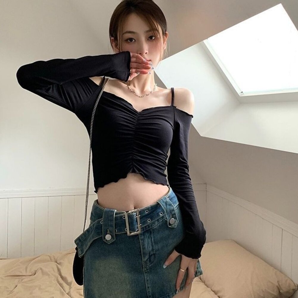 【台灣發貨】韓版設計感一字領短版上衣 長袖上衣 長袖t恤 衣服 女裝 上衣【W613】-圖片-1