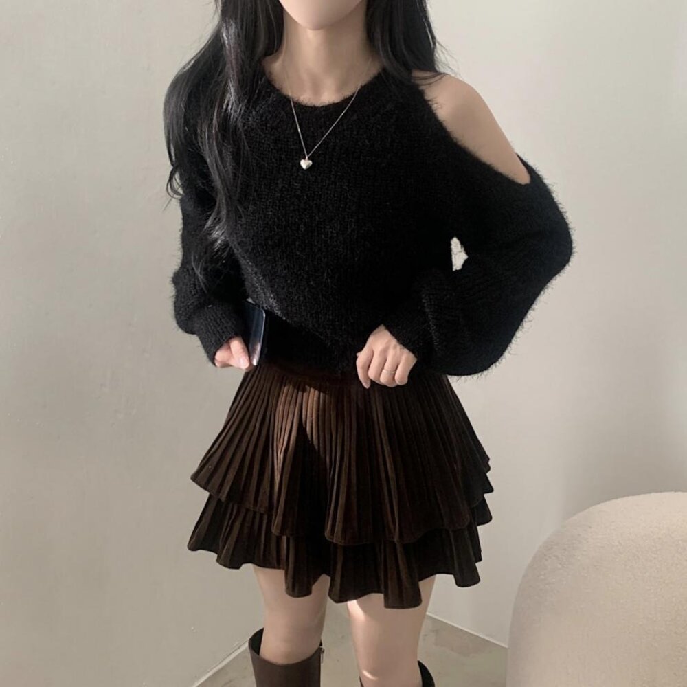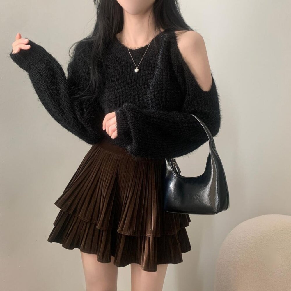 【台灣發貨】韓版氣質短版露肩毛衣 長袖上衣 長袖t恤 衣服 女裝 上衣【W696】-圖片-5