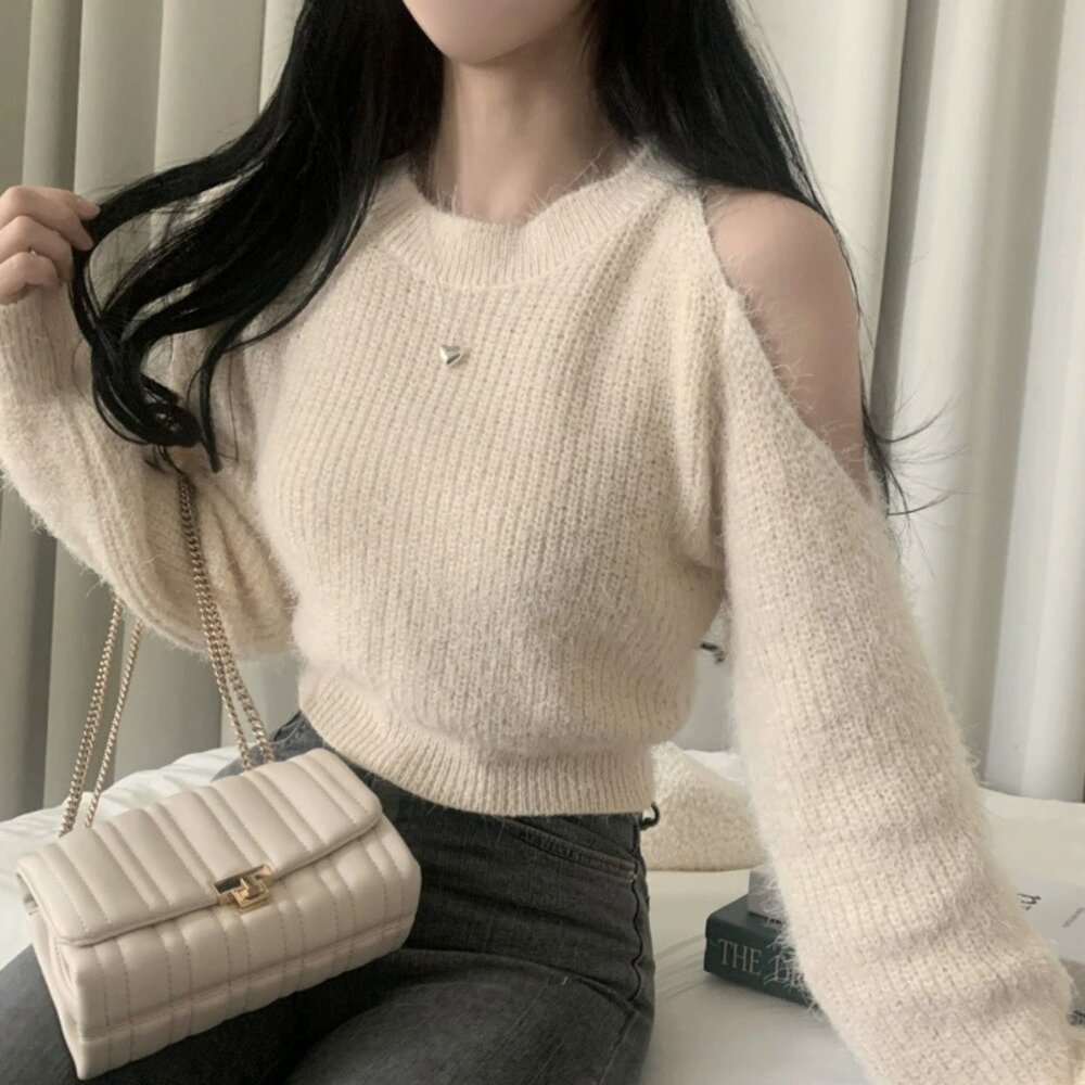 【台灣發貨】韓版氣質短版露肩毛衣 長袖上衣 長袖t恤 衣服 女裝 上衣【W696】-圖片-1