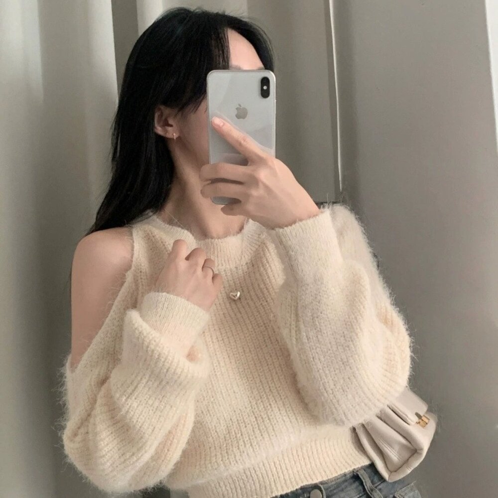 【台灣發貨】韓版氣質短版露肩毛衣 長袖上衣 長袖t恤 衣服 女裝 上衣【W696】-圖片-7
