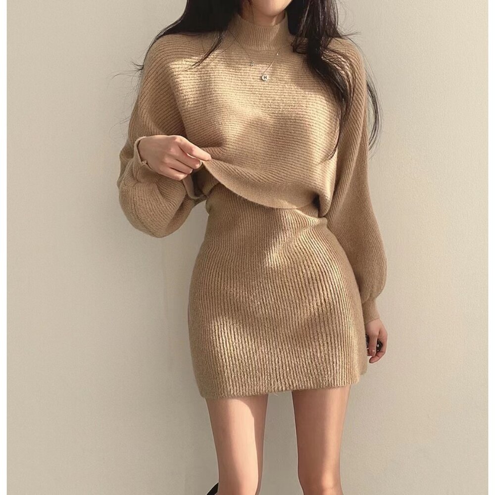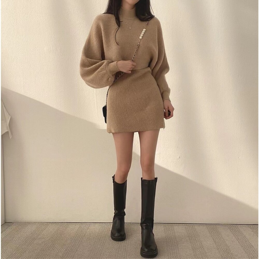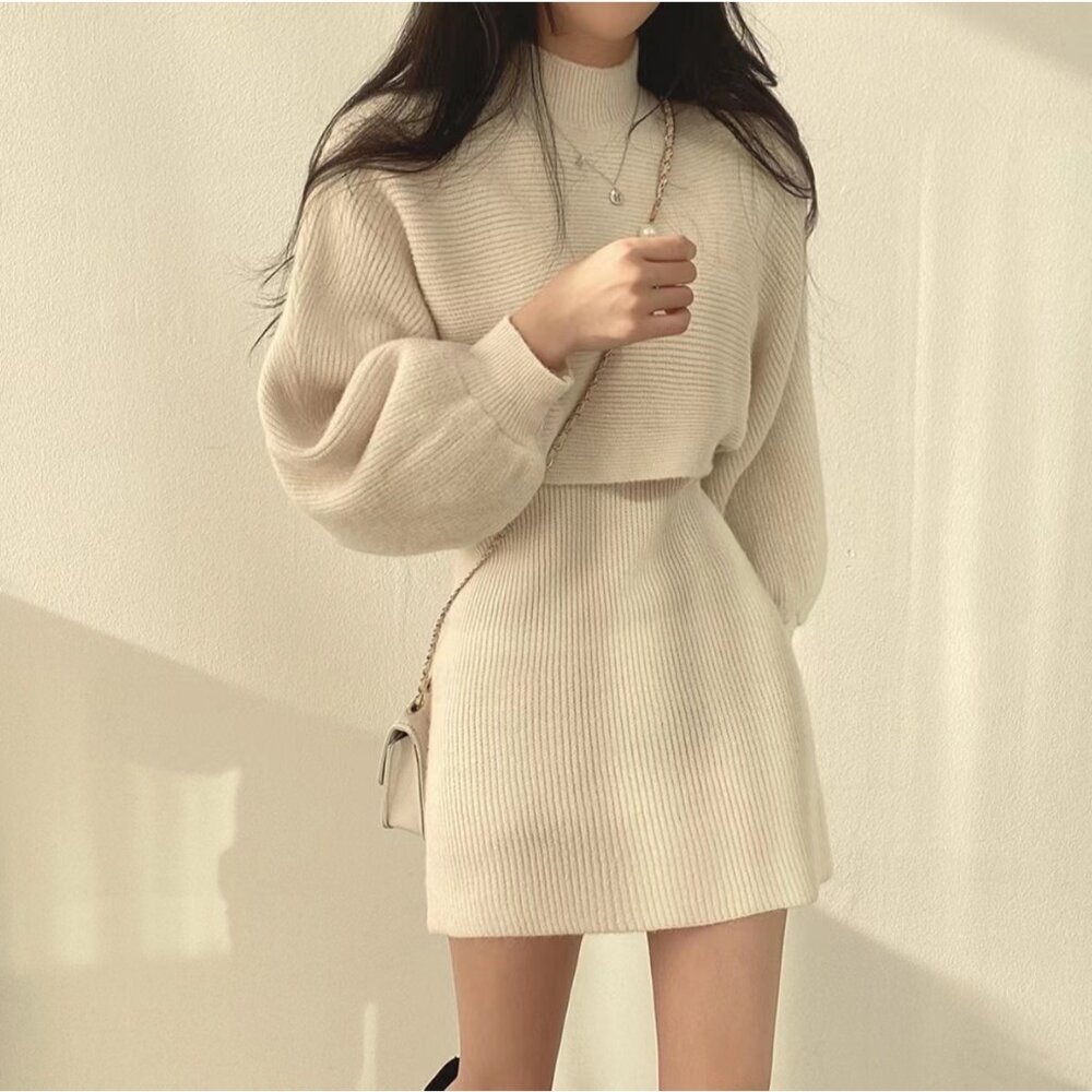 【台灣發貨】韓版氣質高領短版針織上衣+針織背心連身裙 套裝 連身裙 吊帶裙 吊帶褲 女裝【S158】-圖片-1
