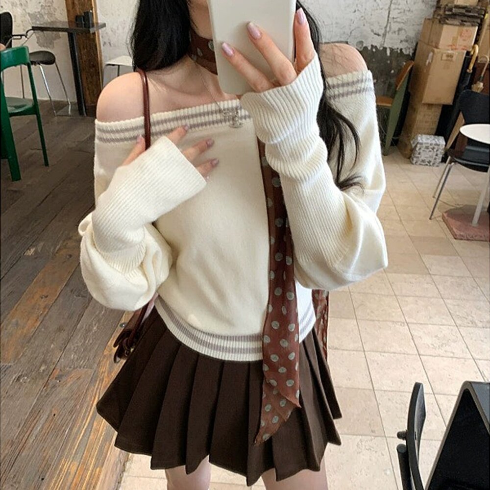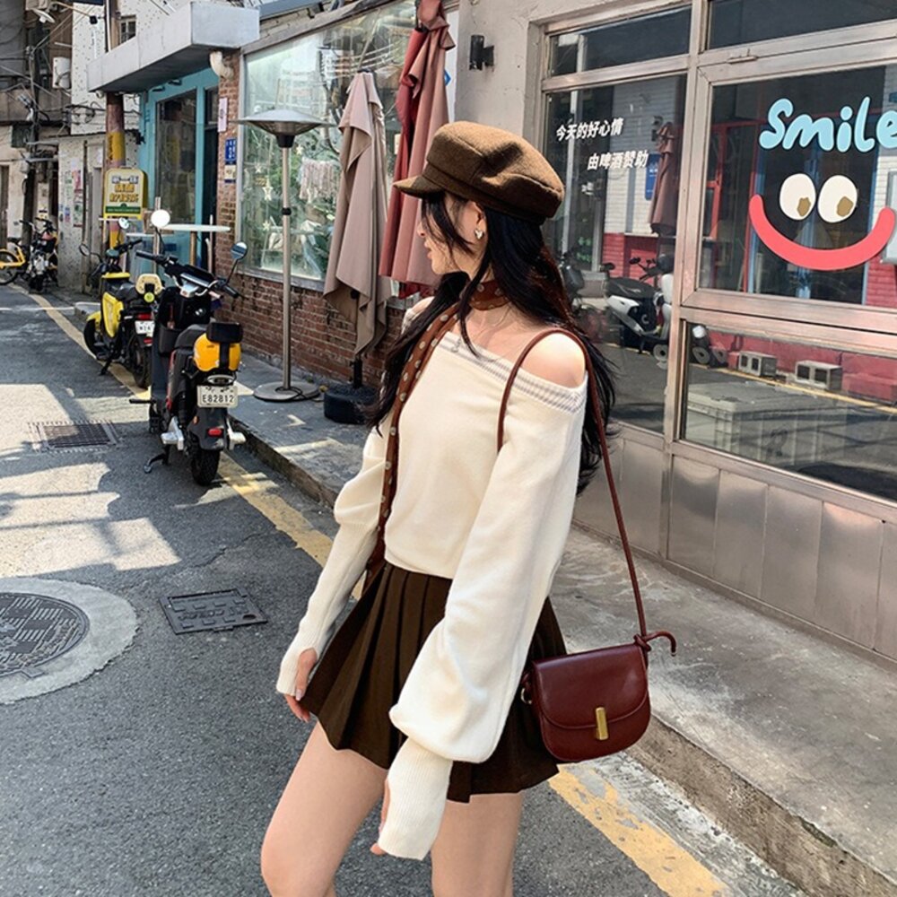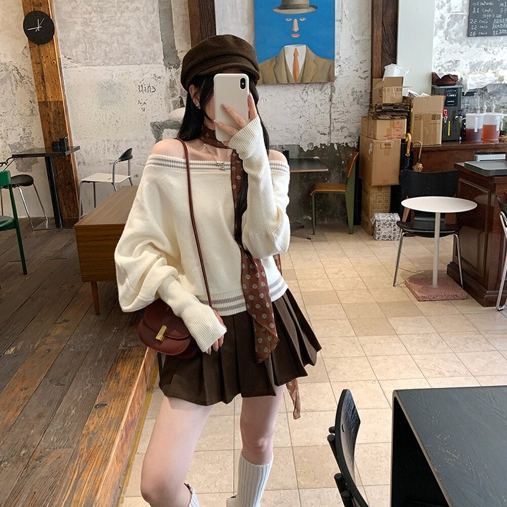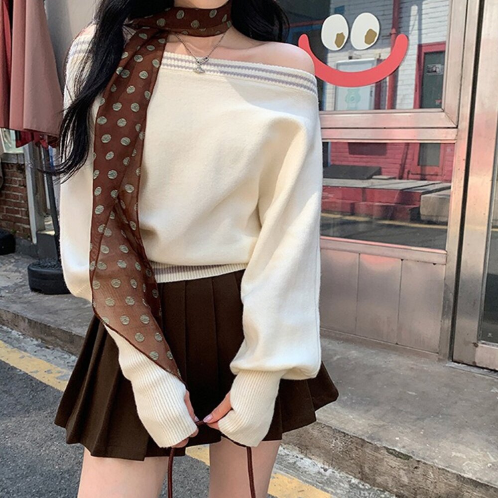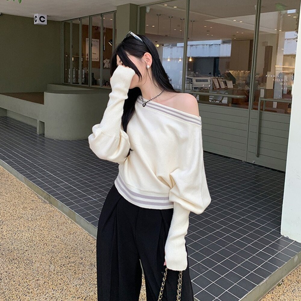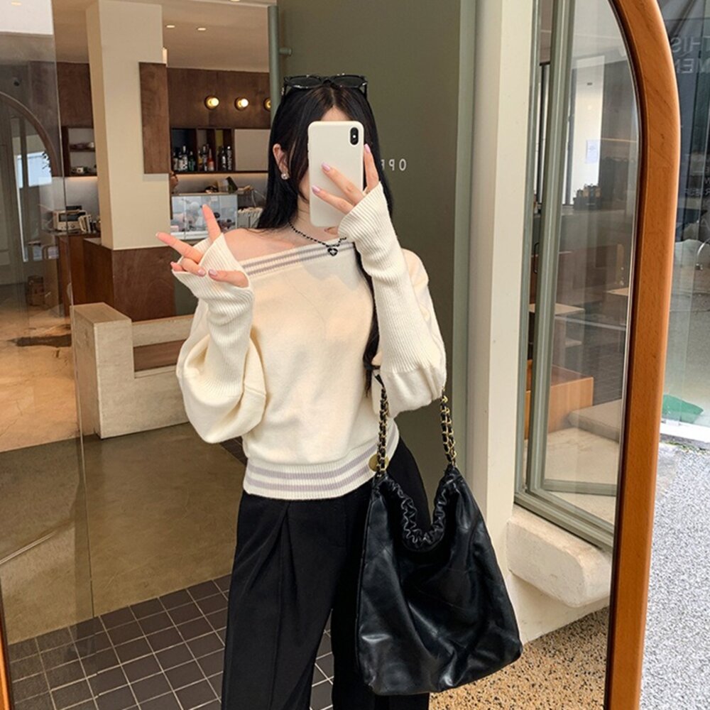 【台灣發貨】韓版氣質露肩一字領針織上衣 長袖上衣 長袖t恤 衣服 女裝 上衣【W695】-圖片-7