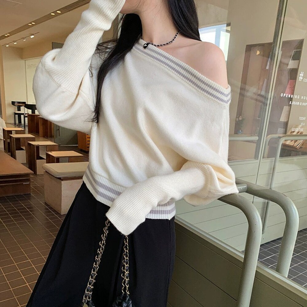 【台灣發貨】韓版氣質露肩一字領針織上衣 長袖上衣 長袖t恤 衣服 女裝 上衣【W695】-圖片-1